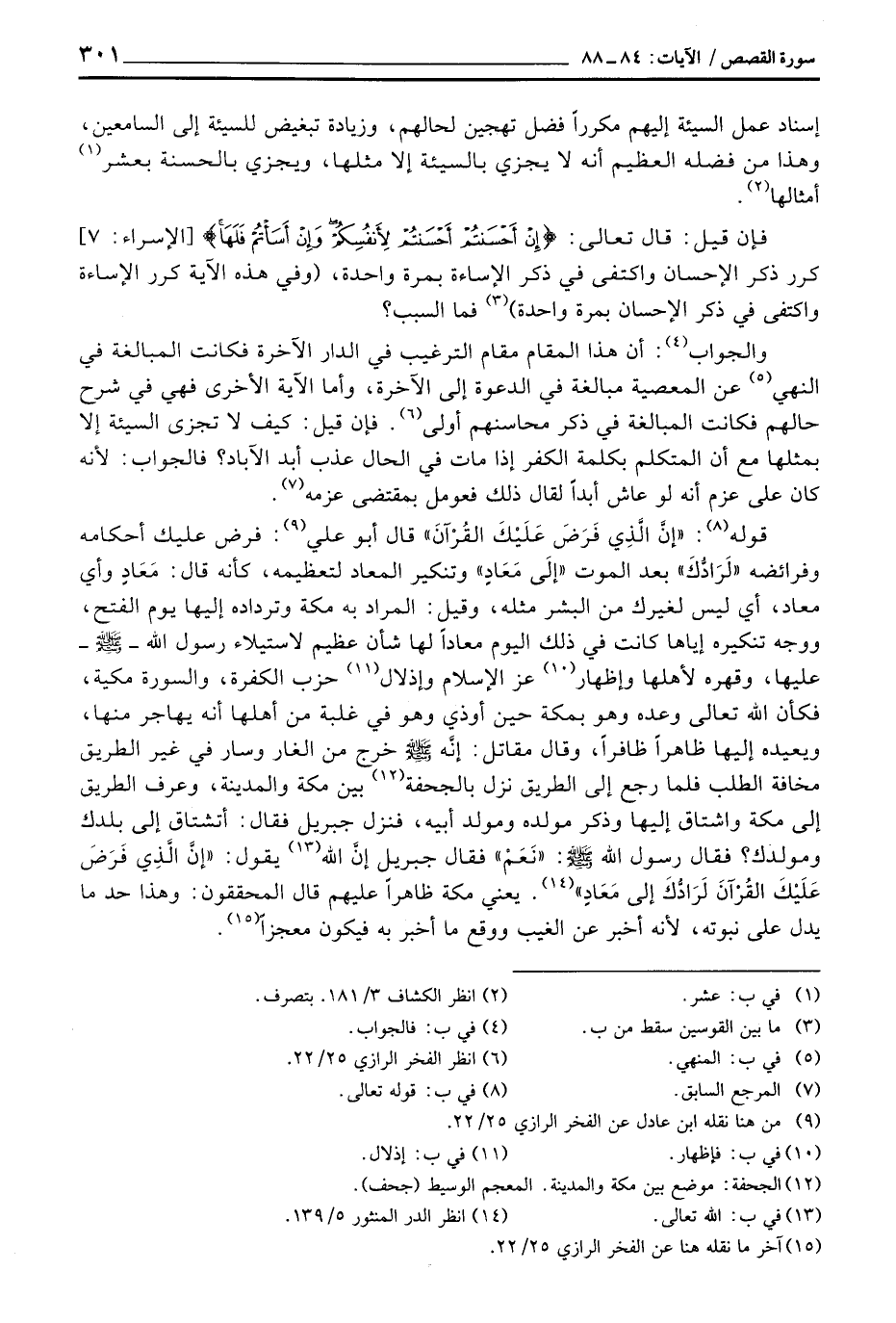 قوله: {إِنَّ الذي فَرَضَ عَلَيْكَ القرآن} قال أبو علي: فرض عليك أحكامه وفرائضه «لَرَادُّكَ» بعد الموت «إلَى مَعَادٍ» وتنكير المعاد لتعظيمه، كأنه قال: مَعَادٍ وأي معاد، أي ليس لغيرك من البشر مثله، وقيل: المراد به مكة وترداده إليها يوم الفتح، ووجه تنكيره إياها كانت في ذلك اليوم معاداً لها شأن عظيم لاستيلاء رسول الله - صَلَّى اللَّهُ عَلَيْهِ وَسَلَّم َ - عليها، وقهره لأهلها وإظهار عز الإسلام وإذلال حزب الكفرة، والسورة مكية، فكأن الله تعالى وعده وهو بمكة حين أوذي وهو في غلبة من أهلها أنه يهاجر منها، ويعيده إليها ظاهراً ظافراً، وقال مقاتل: «إنَّه صَلَّى اللَّهُ عَلَيْهِ وَسَلَّم َ خرج من الغار وسار في غير الطريق مخافة الطلب فلما رجع إلى الطريق نزل بالجحفة بين مكة والمدينة، وعرف الطريق إلى مكة واشتاق إليها وذكر مولده ومولد أبيه، فنزل جبريل فقال: أتشتاق إلى بلدك ومولدك؟ فقال رسول الله صَلَّى اللَّهُ عَلَيْهِ وَسَلَّم َ:» نَعَمْ «فقال جبريل إنَّ الله يقول: {إِنَّ الذي فَرَضَ عَلَيْكَ القرآن لَرَآدُّكَ إلى مَعَادٍ} » يعني مكة ظاهراً عليهم قال المحققون: وهذا حد ما يدل على نبوته، لأنه أخبر عن الغيب ووقع ما أخبر به فيكون معجزاً.