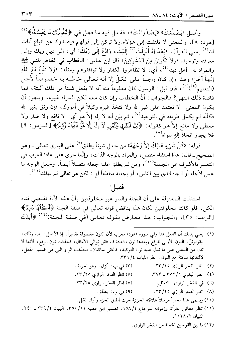 قوله: {كُلُّ شَيْءٍ هَالِكٌ إِلاَّ وَجْهَهُ} من جعل شيئاً يطلق على الباري تعالى - وهو الصحيح - قال: هذا استثناء متصل، والمراد بالوجه الذات، وإنَّما جرى على عادة العرب في التعبير بالأشرف عن الجملة، ومن لم يطلق عليه جعله متصلاً أيضاً، وجعل الوجه ما عمل لأجله أو الجاه الذي بين الناس، أو يجعله منقطعاً أي: لكن هو تعالى لم يهلك.