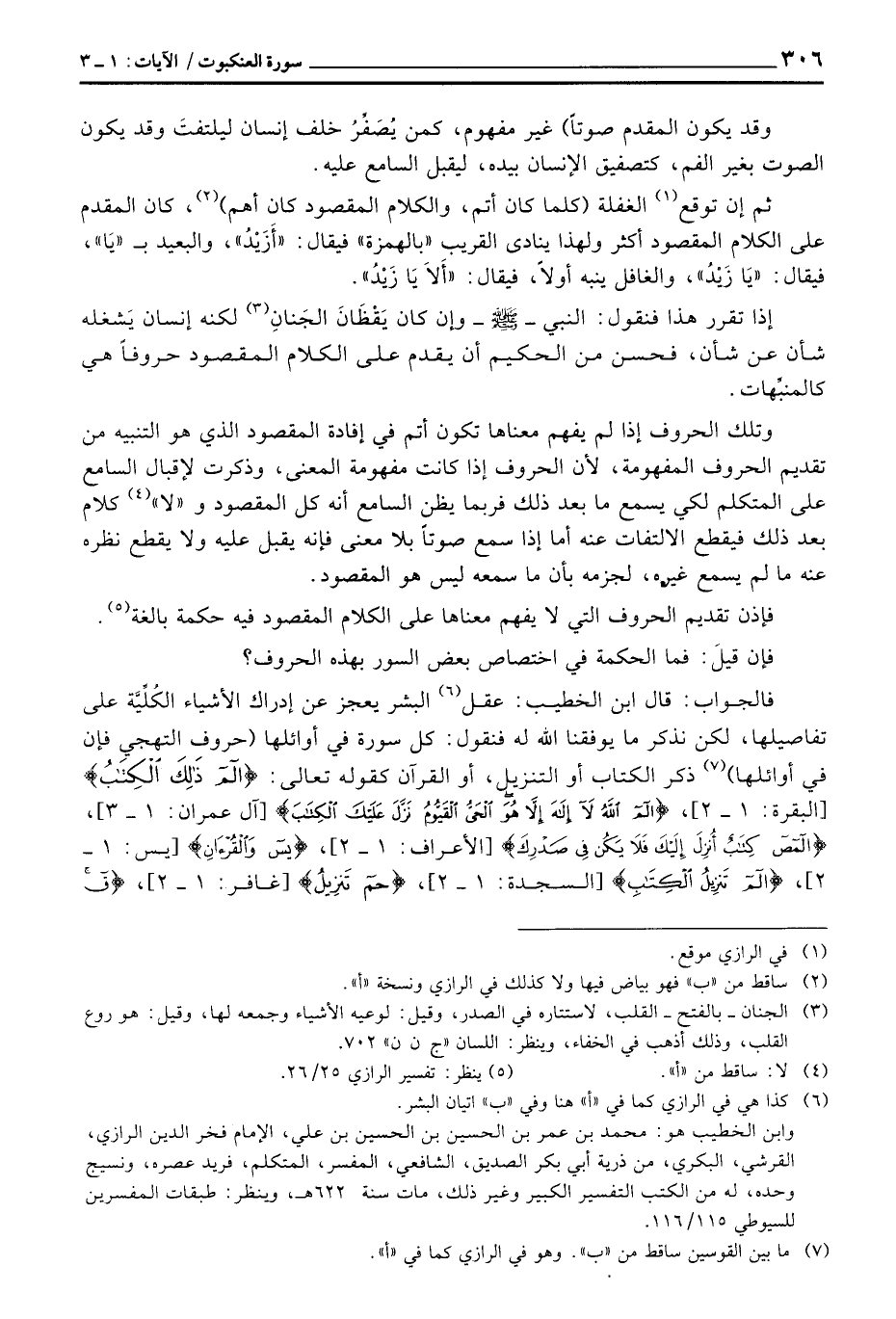 فالجواب: قال ابن الخطيب: عقل البشر يعجز عن إدراك الأشياء الكُلِّيَّة على تفاصيلها، لكن نذكر ما يوفقنا الله له فنقول: كل سورة في أوائلها (حروف التهجي فإن في أوائلها) ذكر الكتاب أو التنزيل، أو القرآن كقوله تعالى: {الم ذَلِكَ الكتاب} [البقرة: 1 - 2] ،