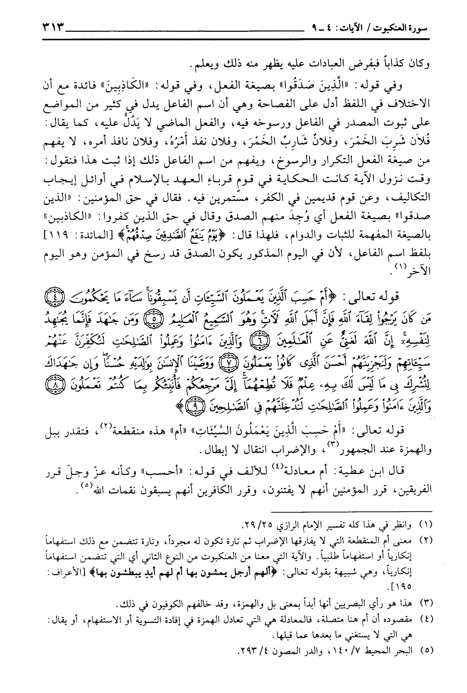 قال ابن عطية: أم معادلة للألف في قوله: «أحسب» وكأنه عزّ وجلّ قرر الفريقين، قرر المؤمنين أنهم لا يفتنون، وقرر الكافرين أنهم يسبقون نقمات الله.
