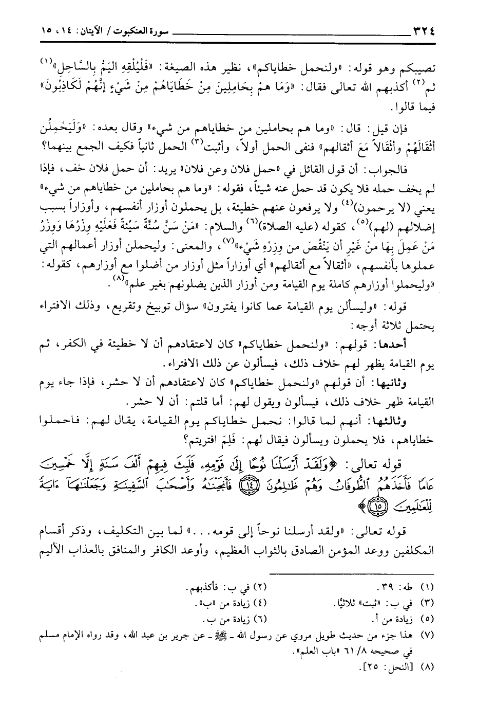 فالجواب: أن قول القائل في» حمل فلان وعن فلان «يريد: أن حمل فلان خف، فإذا لم يخف حمله فلا يكون قد حمل عنه شيئاً، فقوله: {وما هم بحاملين من خطاياهم من شيء} يعني (لا يرحمون) ولا يرفعون عنهم خطيئة، بل يحملون أوزار أنفسهم، وأوزاراً بسبب إضلالهم (لهم) ، كقوله (عليه الصلاة) والسلام:» مَنْ سَنَّ سُنَّةً سَيِّئةً فَعَلَيْهِ وِزْرُهَا وَوِزْرُ مَنْ عَمِلَ بِهَا منْ غَيْرِ أن يَنْقُصَ من وِزِرْهِ شَيْء «، والمعنى: وليحملن أوزار أعمالهم التي عملوها بأنفسهم،» أثقالاً مع أثقالهم «أو أوزاراً مثل أوزار من أضلوا مع أوزارهم، كقوله: {وليحملوا أوزارهم كاملة يوم القيامة ومن أوزار الذين يضلونهم بغير علم} .