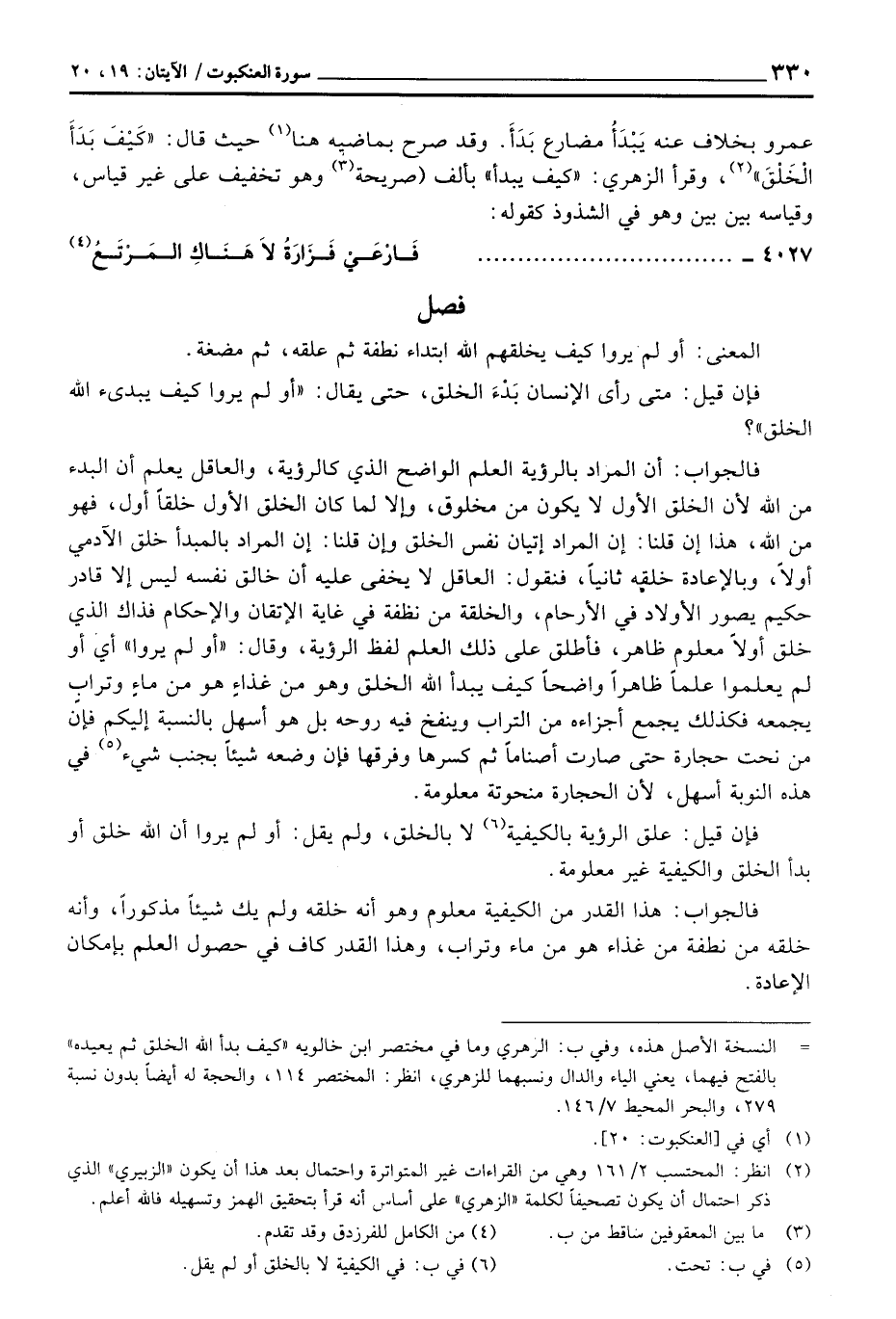 فإن قيل: علق الرؤية بالكيفية لا بالخلق، ولم يقل: أو لم يروا أن الله خلق او بدأ الخلق والكيفية غير معلومة.