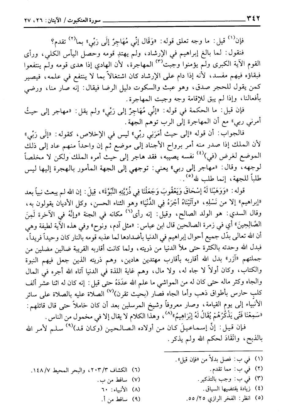 فنقول: لما بالغ إبراهيم في الإرشاد، ولم يهتدِ قومه وحصل اليأس الكلي، ورأى القوم الآية الكبرى ولم يؤمنوا وجبت المهاجرة، لأن الهادي إذا هدى قومه ولم ينتفعوا فبقاؤه فيهم مفسد، لأنه إذا دام على الإرشاد كان اشتغالاً بما لا ينتفع في علمه، فيصير كمن يقول للحجر صدق، وهو عبث والسكوت دليل الرضا فيقال: إنه صار منا، ورضي بأفعالنا، وإذا لم يبق للإقامة وجه وجبت المهاجرة.