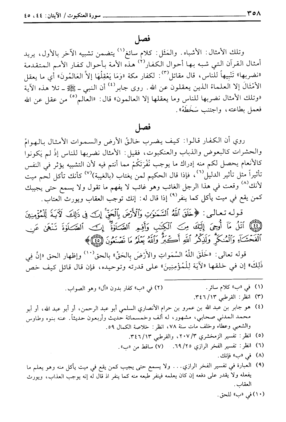 وتلك الأمثال: الأشباه، والمَثَل: كلام سائغ يتضمن تشبيه الآخر بالأول، يريد امثال القرآن التي شبه بها أحوال الكفار هذه الأمة بأحوال كفار الأمم المتقدمة «نضربها» تَنْبِيهاً للناس، قال مقاتل: لكفار مكة {وَمَا يَعْقِلُهَآ إِلاَّ العالمون} أي ما يعقل الأمْثَالَ إلا العلماءُ الذين يعقلون عن الله. روى جابر «أن النبي - صَلَّى اللَّهُ عَلَيْهِ وَسَلَّم َ - تلا هذه الآية {وتلك الأمثال نضربها للناس وما يعقلها إلا العالمون} قال:» العالم من عقل عن الله فعمل بطاعته، واجتنب سَخَطَهُ «