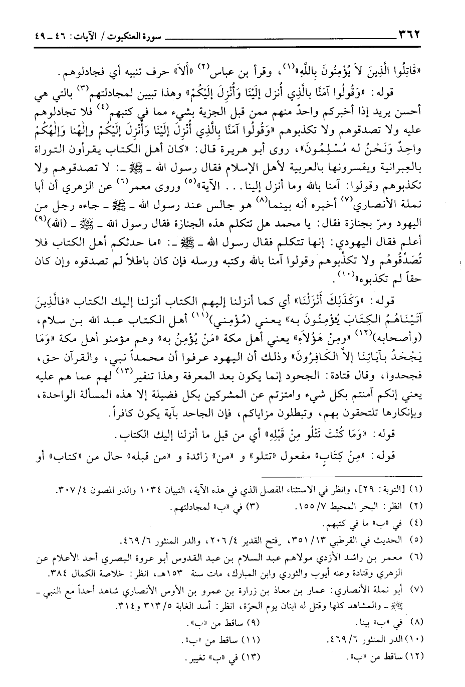 قوله: {وقولوا آمَنَّا بالذي أُنزِلَ إِلَيْنَا وَأُنزِلَ إِلَيْكُمْ} وهذا تبين لمجادلتهم بالتي هي أحسن يريد إذا أخبركم واحٌ منهم ممن قبل الجزية بشيء مما في كتبهم فلا تجادلوهم عله ولا تصدقوهم ولا تكذبوهم {وقولوا آمَنَّا بالذي أُنزِلَ إِلَيْنَا وَأُنزِلَ إِلَيْكُمْ وإلهنا وإلهكم وَاحِدٌ وَنَحْنُ لَهُ مُسْلِمُونَ} ، روى أبو هريرة قال: «كان أهل الكتاب يقرأون التوراة بالعِبرانية ويفسرونها بالعربية لأهل الإسلام فقال رسول الله - صَلَّى اللَّهُ عَلَيْهِ وَسَلَّم َ -: لا تصدقوهم ولا تكذبهم وقولوا: آمنا بالله وما نزل إلينا ... الآية» وروى معمر عن الزهري أن أبا نملة الأنصاري أخبره أنه بينما هو جالس عند رسول الله - صَلَّى اللَّهُ عَلَيْهِ وَسَلَّم َ - جاءه رجل من اليهود ومرّ بجنازة فقالك يا محمد هل تتكلم هذه الجنازة فقال رسول الله - صَلَّى اللَّهُ عَلَيْهِ وَسَلَّم َ - (الله) أعلم فقال اليهودي: إنها تتكلم فقال رسول الله - صَلَّى اللَّهُ عَلَيْهِ وَسَلَّم َ -: «ما حدثكم أهل الكتاب فلا تُصَدِّقُوهُم ولا تكذِّبوهم وقولوا آمنا بالله وكتبه ورسله فإن كان باطلاً لم تصدقوه وإن كان حقاً لم تكذبوه»