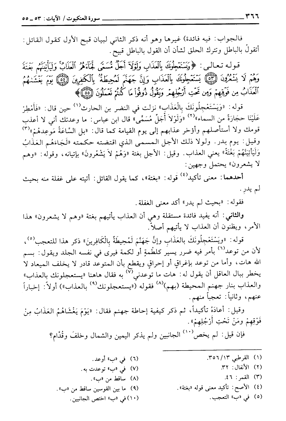 قوله: {يَسْتَعْجِلُونَكَ بالعذاب وَإِنَّ جَهَنَّمَ لَمُحِيطَةٌ بالكافرين} ذكر هذا للتعجب، لأن من توعد بأمر فيه ضرر يسير كلطْمةٍ أو لكمة فيرى في نفسه الجلد ويقول: بسم الله هات، وأما من توعد بإغراقٍ أو إحراقٍ ويقطع بأن المتوعد قادر لا يخلف الميعاد لا يخطر ببال العاقل أن يقول له: هات ما توعدني به فقال ههنا «يستعجلونك بالعذاب» والعذاب بنار جهنم المحيطة (بهم) فقوله ( «يستعجلونك بالعذاب» ) أولاً: إخباراً عنهم، وثانياً: تعجباً منهم.