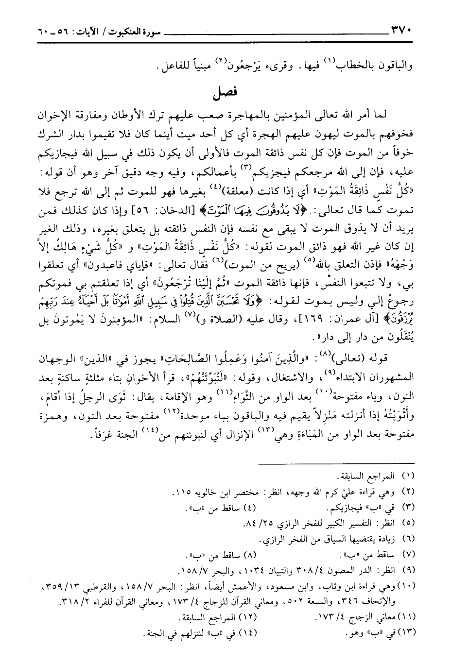 لما أمر الله تعالى المؤمنين بالمهاجرة صعب عليهم ترك الأوطان ومفارقة الأخوان فخوفهم بالموت ليهون عليهم الهجرة أي كل أحد ميت أينما كان فلا تقيموا بدار الشرك خوفاً من الموت فإن كل نفس ذائقة الموت فالأولى أن يكون ذلك في سبيل الله فيجازيكم عليه، فإن إلى الله مرجعكم فيجزيكم بأعمالكم، وفيه وجه دقيق آخر وهو أن قوله: {كُلُّ نَفْسٍ ذَآئِقَةُ الموت ثُمَّ إِلَيْنَا تُرْجَعُونَ} أي إذا كانت (معلقة) بغيرها فهو للموت ثم إلى الله ترجع فلا تموت كما قال تعالى: {لاَ يَذُوقُونَ فِيهَا الموت} [الدخان: 56] وإذا كان كذلك فمن يريد أن لا يذوق الموت لا يبقى مع نفسه فإن النفس ذائقته بل يتعلق بغيره، وذلك الغير إن كان غير الله فهو ذائق الموت لقوله: {كُلُّ نَفْسٍ ذَآئِقَةُ الموت} و {كُلُّ شَيْءٍ هَالِكٌ إِلاَّ وَجْهَهُ} [القصص: 88] (يريح من الموت) فقال تعالى: «فإياي فاعبدون» أي تعلقوا بي، ولا تتبعوا النفس، فإنها ذائقة الموت {ثُمَّ إِلَيْنَا تُرْجَعُونَ} أي إذا تعلقتم بي فموتكم رجوعٌ إلي وليس بموت لقوله: {وَلاَ تَحْسَبَنَّ الذين قُتِلُواْ فِي سَبِيلِ الله أَمْوَاتاً بَلْ أَحْيَاءٌ عِندَ رَبِّهِمْ يُرْزَقُونَ} [آل عمران: 169] ، وقال عليه (الصلاة و) السلام: «المؤمِنونَ لا يَمُوتونَ بل يُنْقَلُون من دار إلى دار» .