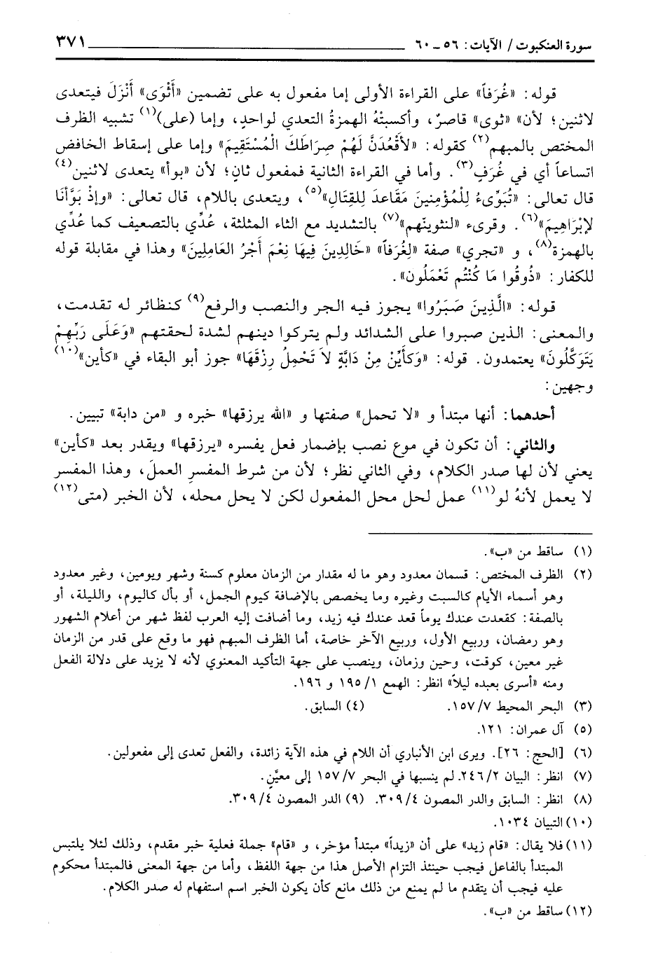 قوله: «غُرَافاً» على القراءة الأولى إما مفعول به على تضمين «أَثْوَى» أَنْزَلَ فيتعدى لاثنين؛ لأنَّ «» ثوى «قاصرٌ، وأكسبتْهُ الهمزةُ التعدي لواحدٍ، وإما (على) تشبيه الظرف المختص بالمبهم كقوله: {لأَقْعُدَنَّ لَهُمْ صِرَاطَكَ المستقيم} [الأعراف: 16] وإما على إسقاط الخافض اتساعاً أي في غُرَفٍ. وأما في القراءة الثانية فمفعول ثانٍ؛ لأن» بوأ «يتعدى لاثنين قال تعالى: {تُبَوِّىءُ المؤمنين مَقَاعِدَ لِلْقِتَالِ} [آل عمران: 121] ، ويتعدى باللام، قال تعالى: {وَإِذْ بَوَّأْنَا لإِبْرَاهِيمَ} [الحج: 26] .