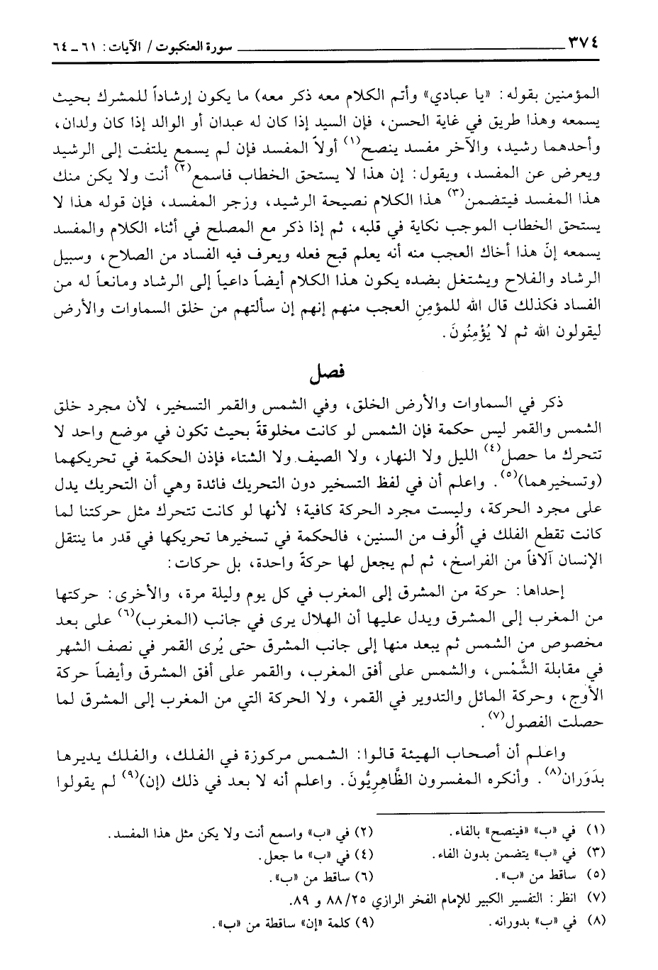 واعلم أن أصحاب الهيئة قالوا: الشمس مركوزة في الفلك، والفلك يديرها بدَوَران. وأنكره المفسرون الظَّاهِريُّونَ. واعلم أنه لا بعد في ذلك (إن) لم يقولوا