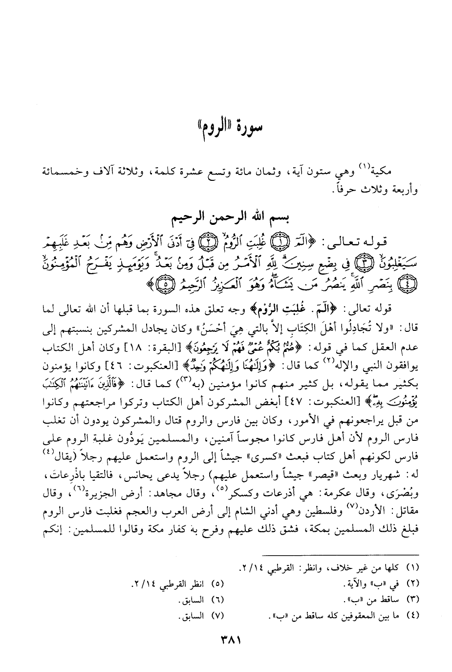مكية وهي ستون آية، وثمان مائة وتسع عشرة كلمة، وثلاثة آلاف وخمسمائة وأربعة وثلاث حرفا. بسم الله الرحمن الرحيم قوله تعالى: {الم غُلِبَتِ الروم} وجه تعلق هذه السورة بما قبلها أن الله تعالى لما قال: {وَلاَ تجادلوا أَهْلَ الكتاب إِلاَّ بالتي هِيَ أَحْسَنُ} وكان يجادل المشركين بنسبتهم إلى عدم العقل كما في قوله: {صُمٌّ بُكْمٌ عُمْيٌ فَهُمْ لاَ يَرْجِعُونَ} [البقرة: 18] وكان أهل الكتاب يوافقون النبي والإله كما قال: {وإلهكم وَاحِدٌ} [العنكبوت: 46] وكانوا يؤمنون بكثير مما يقوله، بل كثير منهم كانوا مؤمنين (به) كما قال: {فالذين آتَيْنَاهُمُ الكتاب يُؤْمِنُونَ بِهِ} [العنكبوت: 47] أبغض المشركون أهل الكتاب وتركوا مراجعتهم وكانوا من قبل يراجعونهم في الأمور، وكان بين فارس والروم قتال والمشركون يودون أن تغلب فارس الروم لأن أهل فارس كانوا مجوساً آمنين، والمسلمين يَودُّون غلبة الروم على فارس لكونهم أهل كتاب فبعث «كسرى» جيشاً إلى الروم واستعمل عليهم رجلاً (يقال له: شهريار وبعث «قيص» جيشاً واستعمل عليهم) رجلاً يدعى يحانس، فالتقيا باذْرِعاتَ، وبُصْرَى، وقال عكرمة: هي أذرعات وكسكر، وقال مجاهد: أرض الجزيرة، وقال مقاتل: الأردن وفلسطين هي أدنى الشام إلى أرض العرب والعجم فغلبت فارس الروم فبلغ ذلك المسلمين بمكة، فشق ذلك عليهم وفرح به كفار مكة وقالوا للمسلمين: إنكم