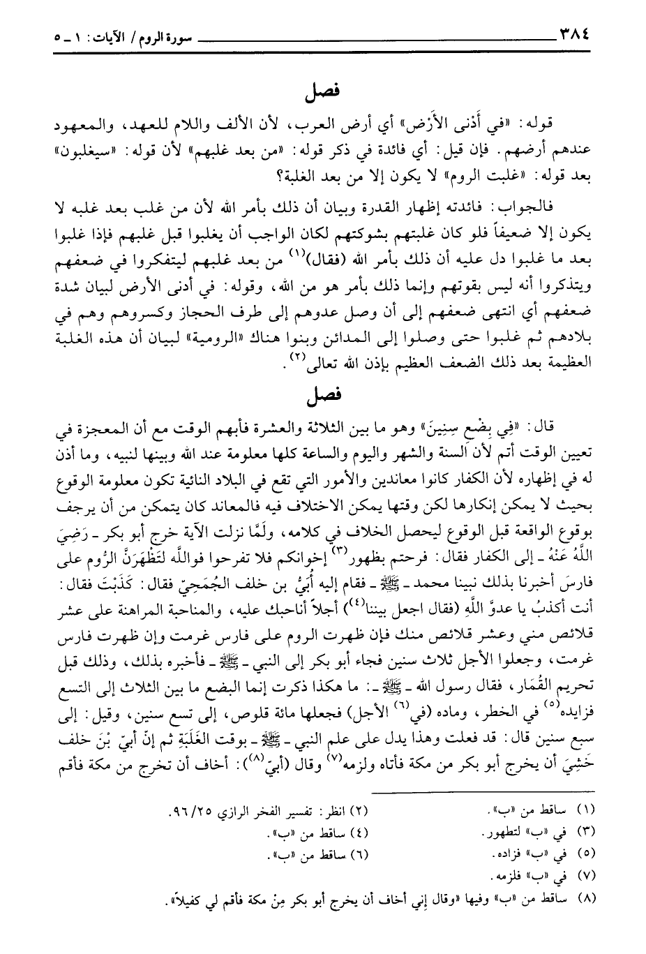 قال: {فِي بِضْعِ سِنِينَ} وهو ما بين الثلاثة والعشرة فأبهم الوقت مع أن المعجزة في تعيين الوقت أتم لأن السنة والشهر واليوم والساعة كلها معلومة عند الله وبينها لنبيه، وما أذن له في إظهاره لأن الكفار كانوا معاندين والأمور التي تقع في البلاد النائية تكون معلومة الوقوع بحيث لا يمكن إنكارها لكن وقتها يمكن الاختلاف فيه فالمعاند كان يتمكن من أن يرجف بوقوع الواقعة قبل الوقوع ليحصل الخلاف في كلامه، ولَمَّا نزلت الآية خرج أبو بكر - رَضِيَ اللَّهُ عَنْهُ - إلى الكفار فقال: فرحتم بظهور إخوانكم فلا تفرحوا فواللَّه لتَظْهَرَنَّ الرُّوم على فارسَ أخبرنا بذلك نبينا محمد - صَلَّى اللَّهُ عَلَيْهِ وَسَلَّم َ - فقام إليه أُبَيُّ بن خلف الجُمَحِيّ فقال: كَذَبْتَ فقال: أنت أكذبُ يا عدوَّ اللَّهِ (فقال اجعل بيننا) أجلاً أن احبك عليه، والمناحبة المراهنة على عشر قلائص مني وعشر قلائص منك فإن ظهرت الروم على فارس غرمت وإن ظهرت فارس غرمت، وجعلوا الأجل ثلاث سنين فجاء أبو بكر إلى النبي - صَلَّى اللَّهُ عَلَيْهِ وَسَلَّم َ - فأخبره بذلك، وذلك قبل تحريم القُمَار، فقال رسول الله - صَلَّى اللَّهُ عَلَيْهِ وَسَلَّم َ -: ما هكذا ذكرت إنما البضع ما بين الثلاث إلى التسع فزايده في الخطر، وماده (في الأجل) فجعلها مائة قلوص، إلى تسع سنين، وقيل: إلى سبع سنين قال: قد فعلت وهذا يدل على علم النبي - صَلَّى اللَّهُ عَلَيْهِ وَسَلَّم َ - بوقت الغَلَبَةِ ثم إنّ أبيّ بْنَ خلف خَشِيَ أن يخرج أبو بكر من مكة فأتاه ولزمه وقال (أبيّ) : أخاف أن تخرج من مكة فأقم