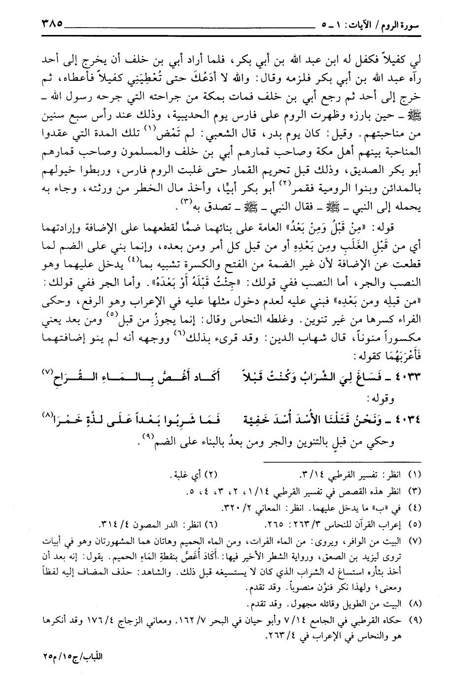وقيل: كان يوم بدر، قال الشعبي: لم تَمْض تلك المدة التي عقدوا المانحبة بينهم أهل مكة وصاحب قمارهم أبي بن خلف والمسلمون وصاحب قمارهم أبو بكر الصديق، وذلك قبل تحريم القمار حتى غلبت الروم فارس، وربطوا خيولهم بالمدائن وبنوا الرومية فقمر أبو بكر أبيّاً، وأخذ مال الخطر من ورثته، وجاء به يحمله إلى النبي - صَلَّى اللَّهُ عَلَيْهِ وَسَلَّم َ - فقال النبي - صَلَّى اللَّهُ عَلَيْهِ وَسَلَّم َ - تصدق به.