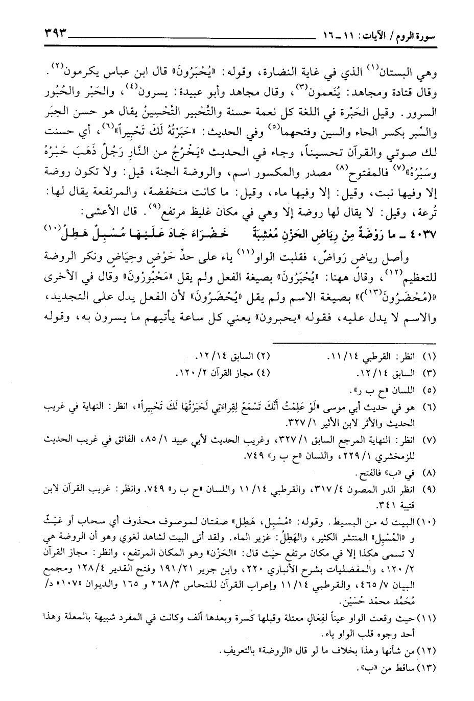 وهي البستان الذي في غاية النضارة، وقوله: «يُحْبَرُونَ» قال ابن عباس يكرمون. وقال قتادة ومجاهد: يُنَعمون، وقال مجاهد وأبو عبيدة: يسرون، والحَبْر والحُبُور السرور. وقيل الحَبْرة في اللغة كل نعمة حسنة والتَّحْبير التَّحْسِينُ يقال هو حسن الحِبرَ والسِّبر بكسر الحاء والسين وفتحهما وفي الحديث: «حَبْرْتُهُ لَكَ تَحْبِيراً» ، أي حسنت لك صوتي والقرآن تحسيناً، وجاء في الحديث «يَخْرُجُ من النَّارِ رَجُلٌ ذَهَبَ حَبْرُهُ وسَبْرُهُ» فالمفتوح مصدر والمكسور اسم، والروضة الجنة، قيل: ولا تكون روضة إلا وفيها نبت، وقيل: إلا وفيها ماء، وقيل: ما كانت منخفضة، والمرتفعة يقال لها: تُرعة، وقيل: لا يقال لها روضة إلا وهي في مكان غليظ مرتفع. قال الأعشى: