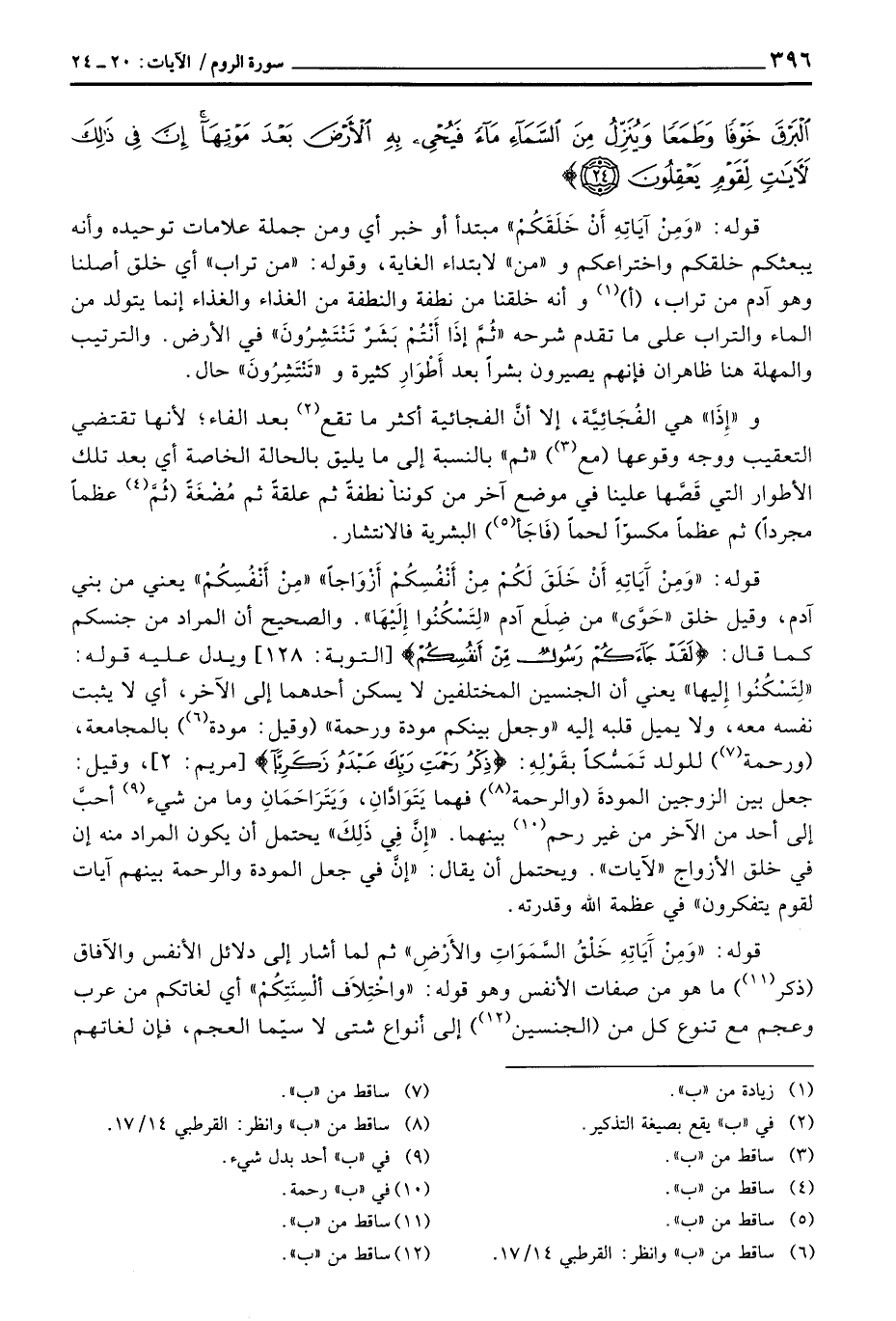 قوله: {وَمِنْ آيَاتِهِ أَنْ خَلَقَكُمْ} مبتدأ أو خبر أي وم جملة علامات توحيده وأنه يبعثكم خلقكم واختراعكم و «من» لابتداء الغاية، وقوله: «من تراب» أي خلق أصلنا وهو آدم من تراب، (أ) وأنه خلقنا من نطفة والنطفة من الغذاء والغذاء إنما يتولد من الماء والتراب على ما تقدم شرحه {ثُمَّ إِذَآ أَنتُمْ بَشَرٌ تَنتَشِرُونَ} في الأرض. والترتيب والمهلة هنا ظاهران فإنهم يصيرون بشراً بعد أَطْوَارِ كثيرة و «تَنْتَشِرُونَ» حال.