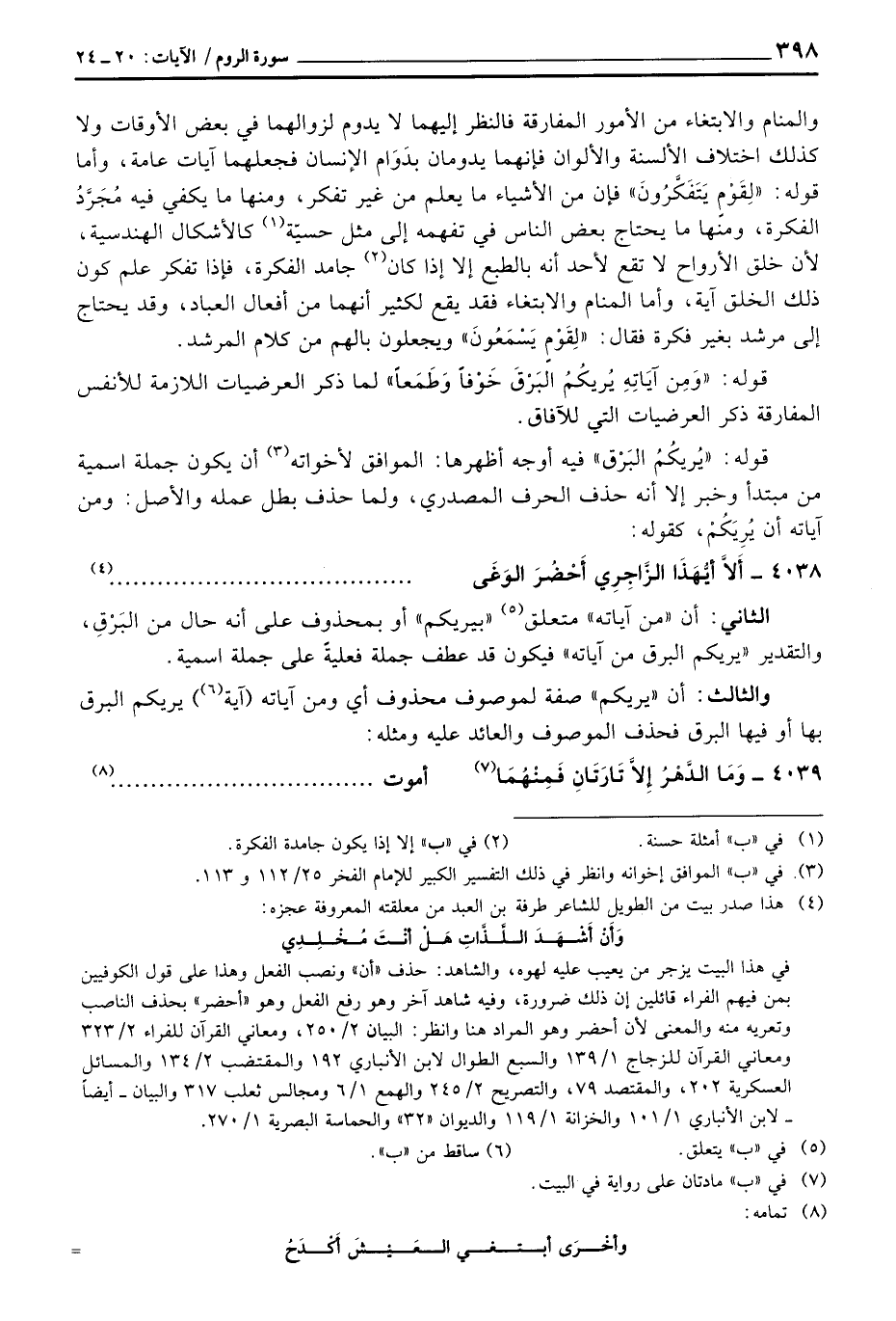 والثالث: أن «يريكم» صفة لموصوف محذوف أي ومن آياته (آية) يريكم البرق بها أو فيها البرق فحذف الموصوف والعائد عليها ومثله: