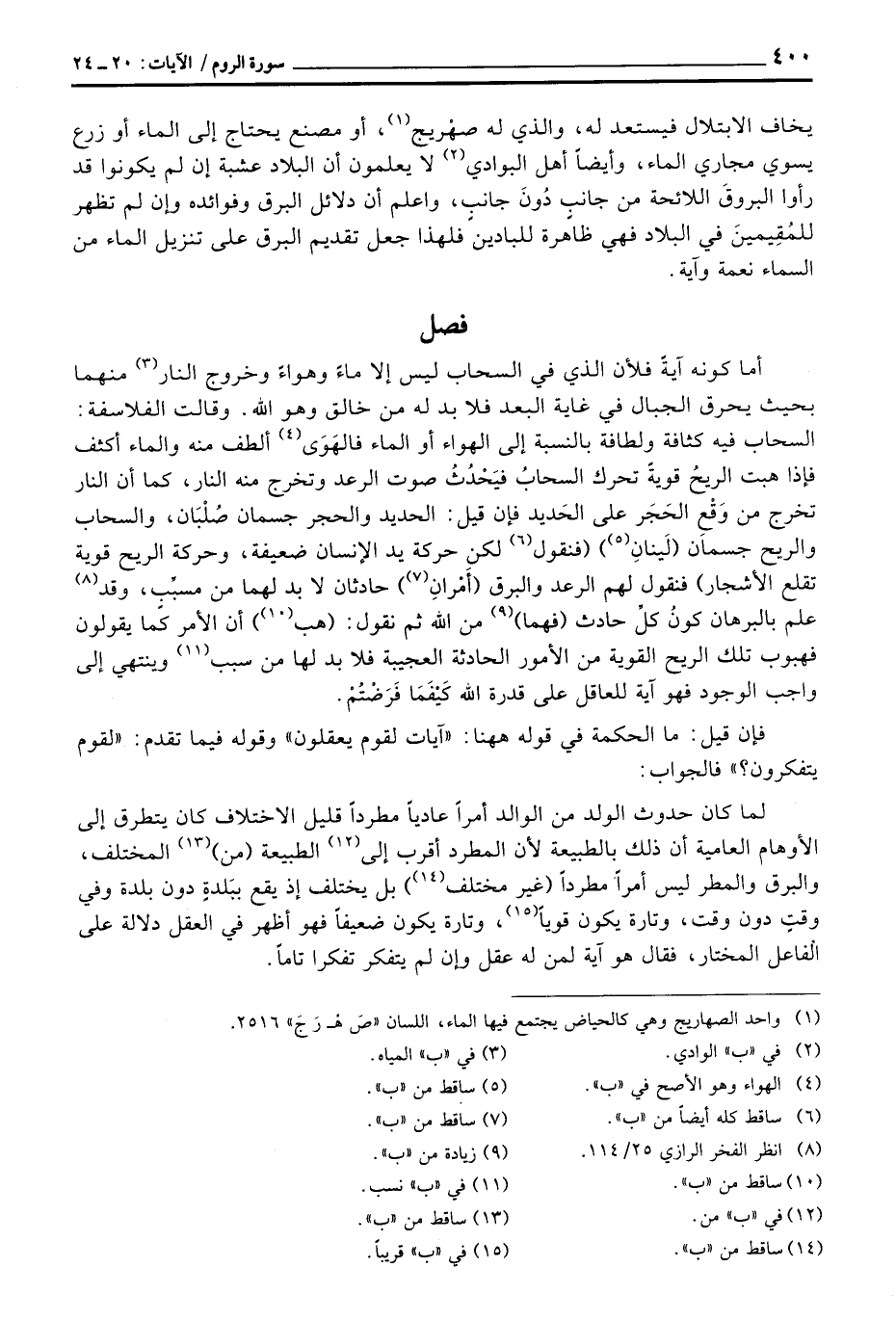 أما كونه آيةً فلأن الذي فس السحاب ليس إلا ماءً وهواءً وخروج النار منهما بحيث يحرق الجبال في غاية البعد فلا بد له من خالق وهو الله. وقالت الفلاسفة: السحاب فيه كثافة ولطافة بالنسبة إلى الهواء أو الماء فالهَوَى ألطف منه والماء أكثف فإذا هبت الريحُ قويةً تحرك السحابُ فيَحْدُثُ صوت الرعد وتخرج منه النار، كما أن النار تخرج من وَقْعِ الحَجَر على الحَديد فإن قيل: الحديد والحجر جسمان صُلْبَان، والسحاب والريح جسمان (لَيَنانٍ) (فنقول لكن حركة يد الإنسان ضعيفة، وحركة الريح قوية تقلع الأشجار) فنقول لهم الرعد والبرق (أَمْرانِ) حادثان لا بد لهما من مسبِّب، وقد علم بالبرهان كونُ كلِّ حادث (فهما) من الله ثم نقول: (هب) أن الأمر كما يقولون فهبوب تلك الريح القوية من الأمور الحادثة العجيبة فلا بد لها من سبب وينتهي إلى واجب الوجود فهو آية للعاقل على قدرة الله كَيْفَمَا فَرَضْتُمْ.