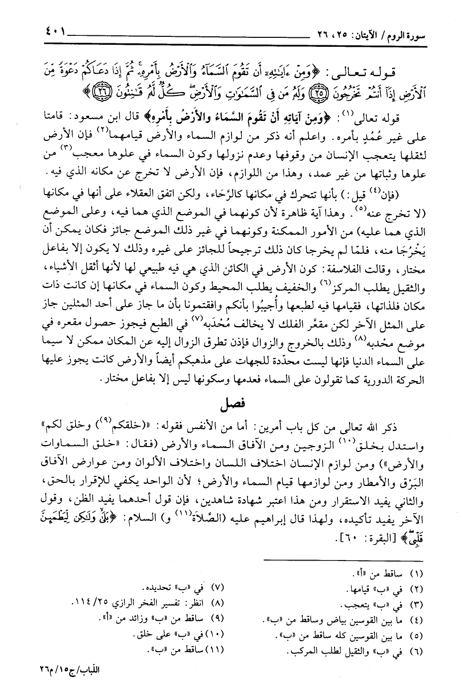 قوله تعالى: {وَمِنْ آيَاتِهِ أَن تَقُومَ السمآء والأرض بِأَمْرِهِ} قال ابن مسعود: قامتا على غير عُمُدٍ بأمره. واعلم أنه ذكر من لوزم المساء والأرض قيامهما فإن الأرض لثقلها يتعجب الإنسان من وقوفها وعدم نزولها وكون السماء في علوها معجب من علوها وثباتها من غير عمد، وهذا من اللوازم، فإن الأرض لا تخرج عن مكانه الذي فيه.