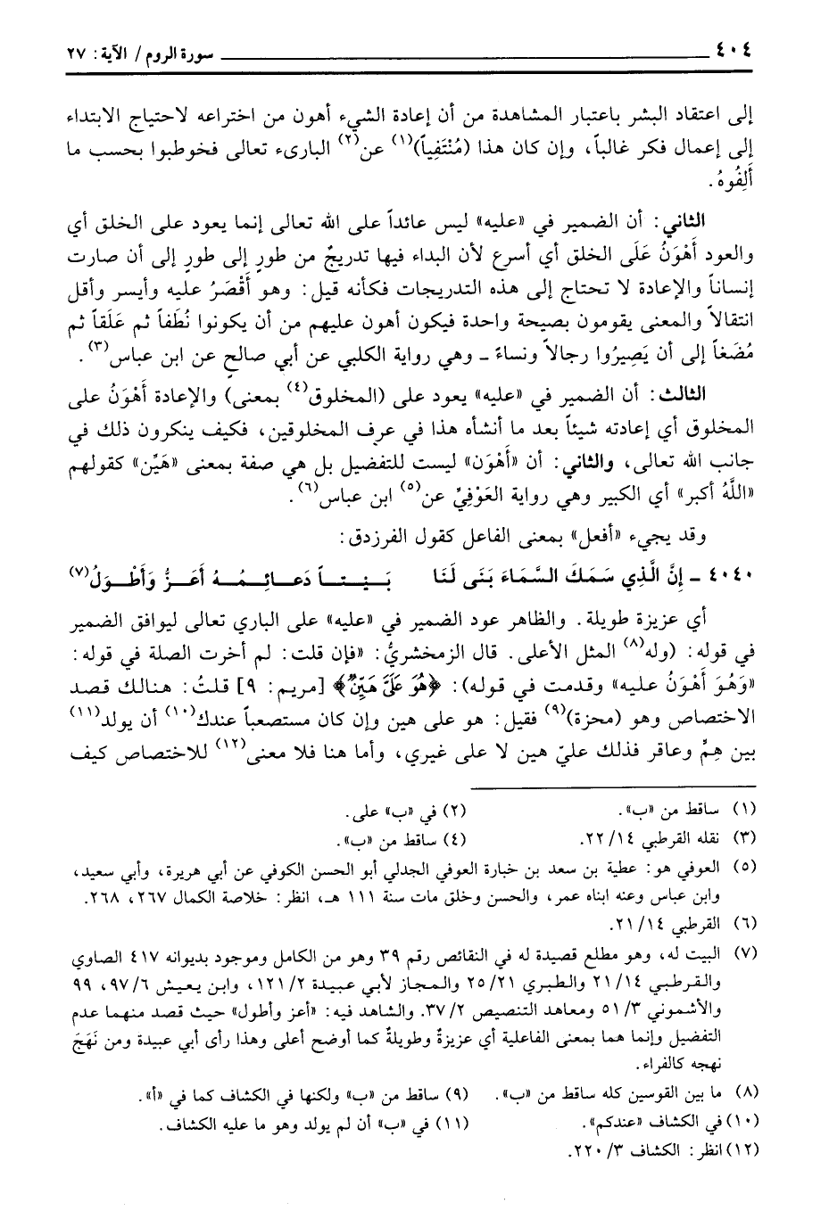 الثالث: أن الضمير في «عليه» يعود على (المخلوق بمعنى) والإعادة أَهْوَنُ على المخلوق أي إعادته شيئاً بعد ما أنشأه هذه في عرف المخلوقين، فكيف ينكرون ذلك في جانب الله تعالى، والثاني: أن «أَهْوَن» ليست للتفضيل بل هي صفة بمعنى «هَيِّن» كقولهم «اللَّهُ أكبر» أي الكبير وهي رواية العَوْفِيِّ عن ابن عباس.