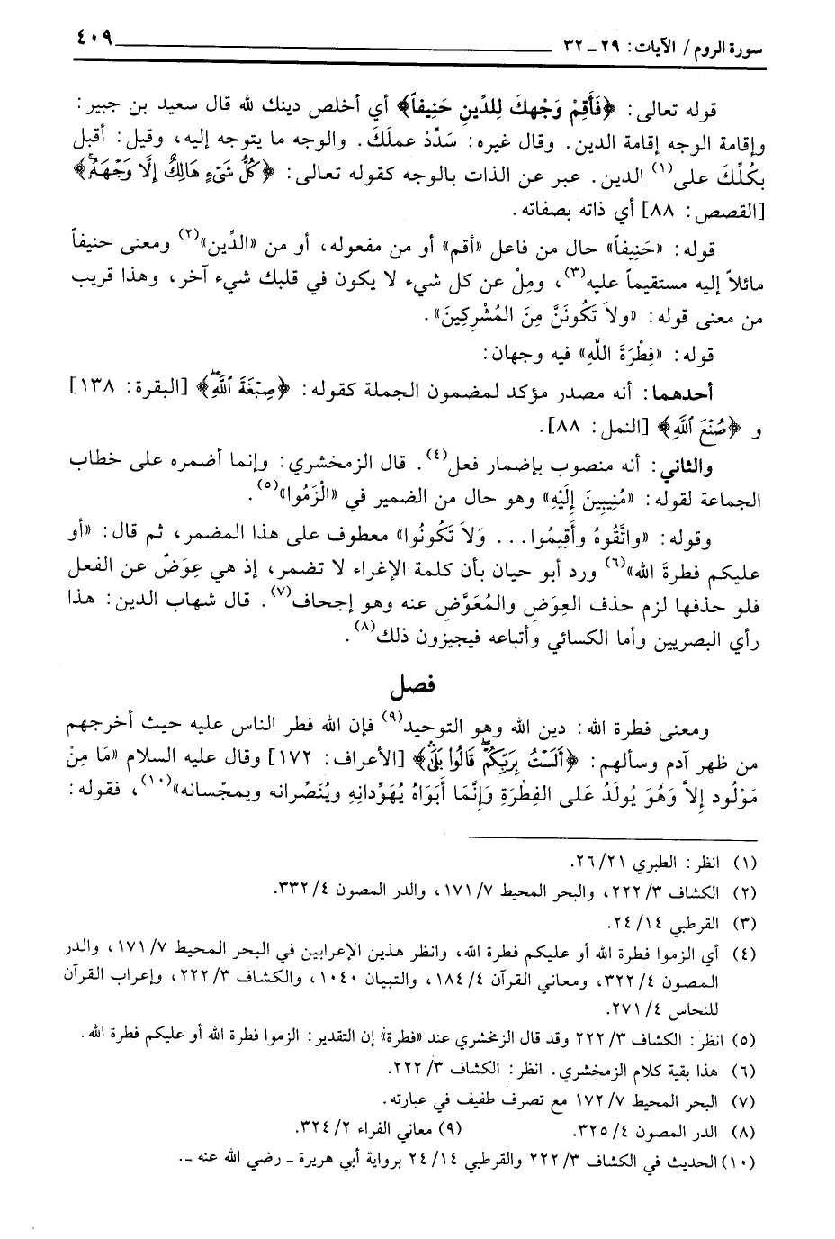 وقوله: {واتَّقُوهُ وأَقِيمُوا ... وَلاَ تَكُونُوا} معطوف على هذا المضمر، ثم قال:» أو عليكم فطرةَ الله «ورد أبو حيان بأن كلمة الإغراء لا تضمر، إذ هي عِوَضٌ عن الفعل فلو حذفها لزم حذف العِوَضِ والمُعَوَّضِ عنه وهو إجحاف. قال شهاب الدين: هذا رأي البصريين وأما الكسائي وتباعه فيجيزون ذلك.