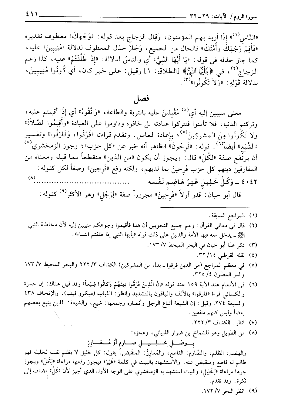 معنى منيبين إليه أي مُقْبِلِينَ عليه بالتوبة والطاعة، «وَاتَّقُوهُ» إي إِذَا أقبلتم عليه، وتركتم الدنيا، فلا تأمنوا فتتركوا عبادته بل خافوه وداوموا على العبادة «وأَقِيمُوا الصَّلاَةَ» ولا تَكُونُوا مِنَ المشركِينَ؛ بإِعادة العامل. وتقدم قراءتا «فَرَّقُوا، وَفَارَقُوا» وتفسير «الشِّيَعِ» أيضاً. قوله: «فَرِحُونَ» الظاهر أنه خبر عن «كل حزب» ؛ وجوز الزمخشري أن يرتفع صفة «لكُلّ» قال: ويجوز أن يكون «من الذين» منقطعاً مما قبله ومعناه من المفارقين دينهم كل حزب فَرِحينَ بما لديهم، ولكنه رفع «فَرِحِين» وصفاً لكل كقوله: