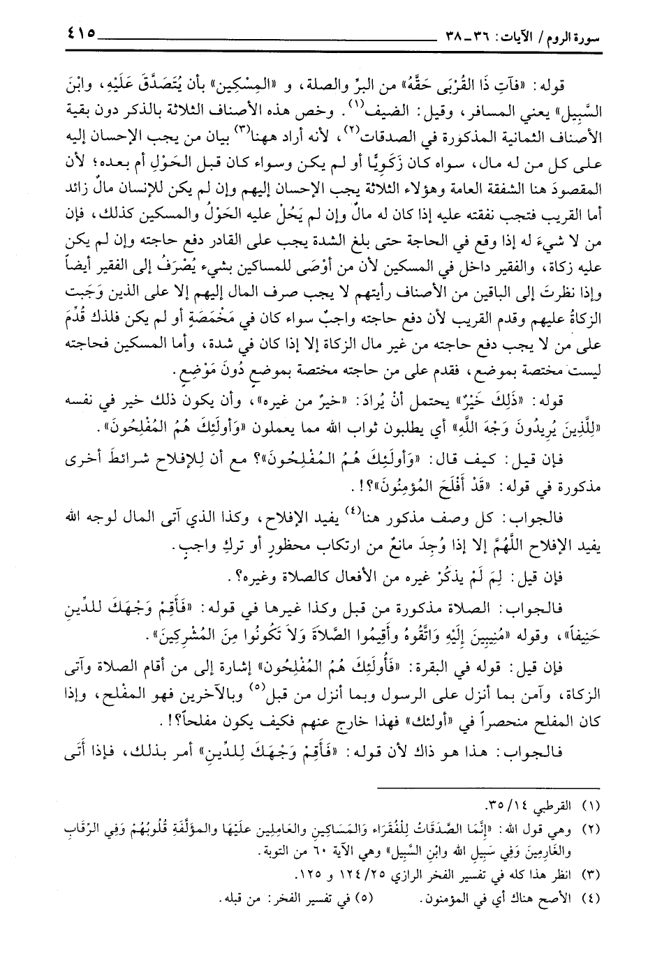قوله: {فَآتِ ذَا القربى حَقَّهُ} من البرِّ والصلة، و «المِسْكِين» بأن يُتَصَدَّقَ عَلَيْهِ، وابْنَ السَّبِيل «يعني المسافر، وقيل: الضيف. وخص هذه الأصناف الثلاثة بالذكر دون بقية الأصناف الثمانية المذكورة في الصدقات، لأنه أراد ههنا بيان من يجب الإحسان إليه على كل من له مال، سواه كان زَكَوِيّاً أو لم يكن وساء كان قبل الحَوْلِ أم بعده؛ لأن المقصودَ هنا الشفقة العامة وهؤلاء الثلاثة يجب الإحسان إليهم وإن لم يكن للأنسان مالٌ زائد أما القريب فتجب نفقته عليه إذا كان له مالٌ وإن لم يَحُلْ عليه الحَوْلُ والمسكين كذلك، فإن من لا شيءَ له إذا وقع في الحاجة حتى بلغ الشدة يجب على القادر دفع حاجته وإن لم يكن عليه زكاة، والفقير داخل في المسكين لأن من أوْصَى للمساكين بشيء يُصْرَفُ إلى الفقير أيضاً وإذا نظرتَ إلى الباقين من الأصناف رأيتهم لا يجب صرف المال إليهم إلا على الذين وَجَبت الزكاةُ عليهم وقدم القريب لأن دفع حاجته واجبٌ سواء كان في مَخْمَصَةٍ أو لم يكن فلذلك قُدِّمَ على من لا يجب دفع حاجته من غير مال الزكاة إلا إذا كان في شدة، وأما المسكين فحاجته ليست مختصة بموضع، فقدم على من حاجته مختصة بموضعٍ دُونَ مَوْضِعٍ.