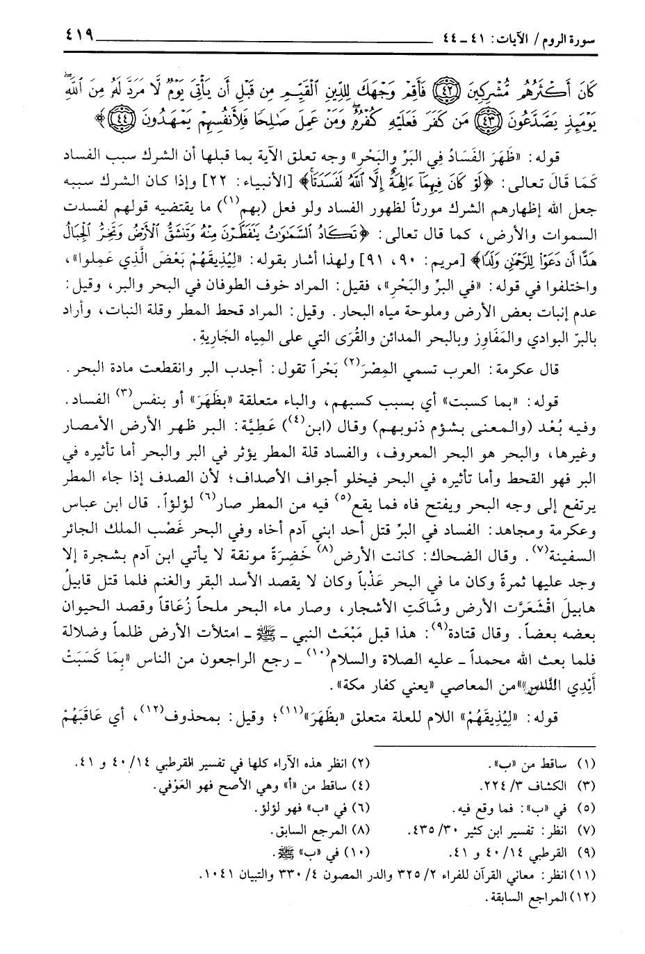 قوله: «بما كسبت» أي بسب كسبهم، والباء متعلقة «بظَهَرَ» أو بنفس الفساد. وفيه بُعْد (والمعنى بشؤم ذنوبهم) وقال (ابن) عَطِيَّة، البر ظهر الأرض الأمصار وغيرها، والبحر هو البحر المعروف، والفساد قلة المطر يؤثر في البر والبحر أما تأثيره في البر فهو القحط وأما تأثيره في البحر فيخلوا أجواف الأصداف؛ لأن الصدف إذا جاء المطر يرتفع إلى وجه البحر ويفتح فاه فما يقع فيه من المطر صار لؤلؤاً. قال ابن عباس وعركمة ومجاهد: الفساد في البرِّ قتل أحد ابني آدم أخاه وفي البحر غَضْب الملك الجائر السفينة. وقال الضحاك: كانت الأرض خَضِرَةً مونقة لا يأتي ابن آدم بشجرة إلا وجد عليها ثمرةً وكان ما في البحر عَذْباً وكان لا يقصد الأسد البقر والغنم فلما قتل قابيلُ هابيلَ اقْشَعَرَّت الأرض وشَاكَتِ الأشجار، وصار ماء البحر ملحاً زُعَاقاً وقصد الحيوان بعضه بعضاً. وقال قتادة: هذا قبل مَبْعَث النبي - صَلَّى اللَّهُ عَلَيْهِ وَسَلَّم َ - امتلأت الأرض ظلماً وضلالة فلما بعث الله محمداً - صَلَّى اللَّهُ عَلَيْهِ وَسَلَّم َ - رجع الراجعون من الناس {بِمَا كَسَبَتْ أَيْدِي الناس} من المعاصي «يعني كفار مكة» .