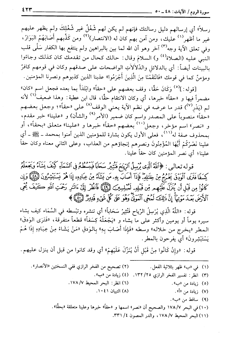 [قوله:] وَكَانَ حَقّاً، وقف بعضهم على «حقاً» وابْتَدَأَ بما بعده فجعل اسم «كان» مضمراً فيها و «حقاً» خبرها، أي وكان الانتقام حقّاً، قال ابن عطية: وهذا ضعيف لأنه لم (يَدْرِ) قدر ما عرضه في نظم الآية يعني الوقف على «حقاً» ؛ وجعل بعضهم «حقاً» منصوباً على المصدر واسم كان ضمير (الأمر والشأن) و «علينا» خبر مقدم، و «نصر» اسم مؤخر، وجعل بعضهم «حقاً» خبرها و «علينا متعلق» بحقاً «، أو بمحذوف صفة له، فعلى الأول يكون بشارة للمؤمنين الذين آمنوا بمحمد - صَلَّى اللَّهُ عَلَيْهِ وَسَلَّم َ - أي علينا نَصْرُكُمْ أَيُّهَا المُؤْمِنُونَ ونصرهم إنجاؤهم من العذاب، وعلى الثاني معناه وكان حقاً علينا؛ أي نصر المؤمنين كان حقاً علينا.