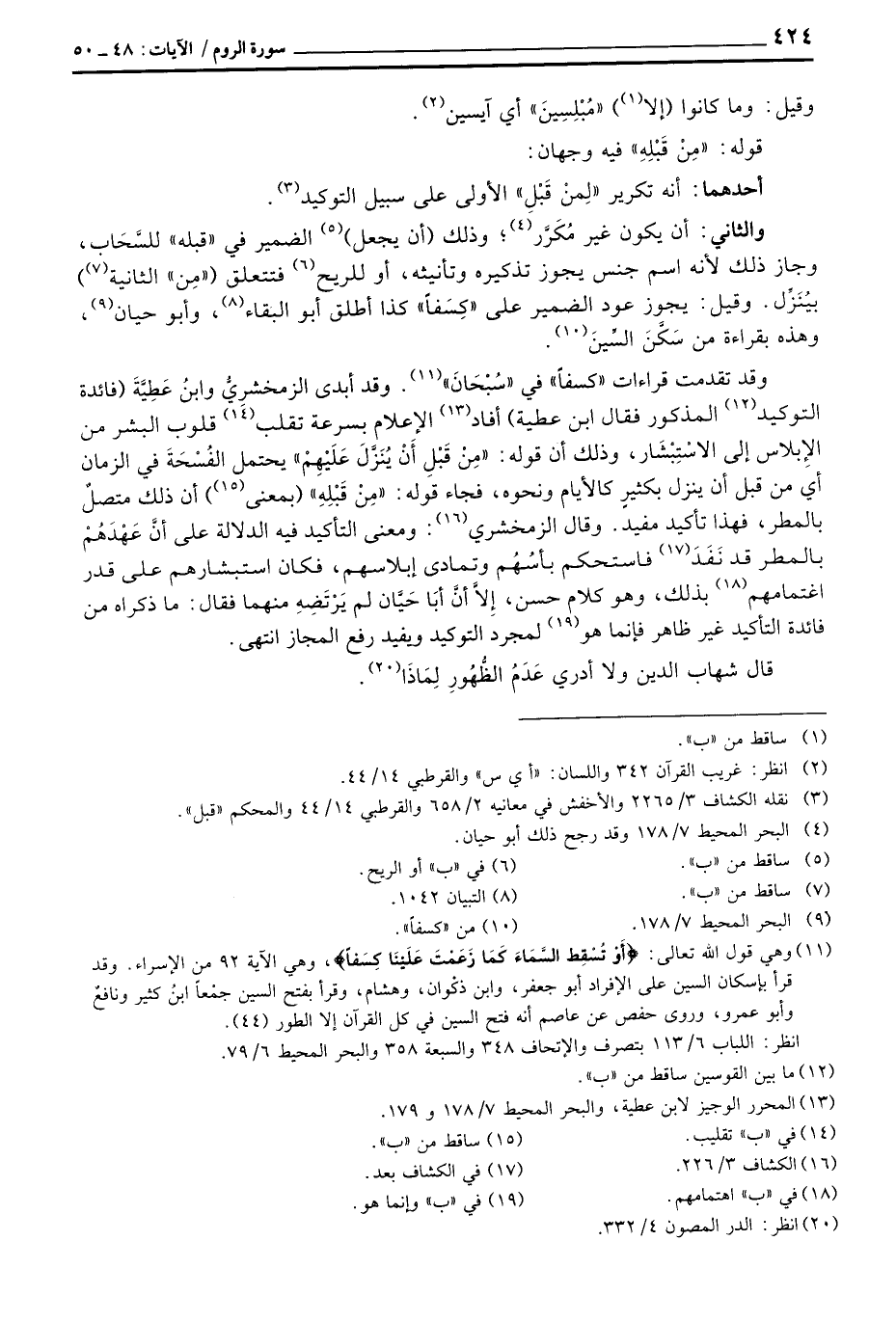 وقد تقدمت قراءات «كسفاً» في «سُبْحَانَ» . وقد أبدى الزمخشريُّ ابنُ عَطِيَّةَ (فائدة التوكيد المذكور فقال ابن عطية) أفاد الإعلام بسرعة تقلب قلوب البشر من الإِبلاس إلى الاسْتِبْشَار، وذلك أن قوله: {مِنْ قَبْلِ أَنْ يُنَزَّلَ عَلَيْهِمْ} يحتمل الفُسْحَةَ في الزمان أي من قبل أن ينزل بكثيرٍ كالأيام ونحوه، فجاء قوله: «مِنْ قَبْلِهِ» (بمعنى) أن ذلك متصلٌ بالمطر، فهذا تأكيد مفيد. وقال الزمخشري: ومعنى التأكيد فيه الدلالة على أنَّ عَهْدَهُمْ بالمطر قد نَفَدَ فاستحكم بأسُهُم وتمادى إبلاسهم، فكان استبشارهم على قدر اغتمامهم بذلك، وهو كلام حسن، إِلاَّ أنَّ أبَا حَيَّان لم يَرْتَضِهِ منهما فقال: ما ذكراه من فائدة التأكيد غير ظاهر فإنما هو لمجرد التوكيد ويفيد رفع المجاز انتهى.
