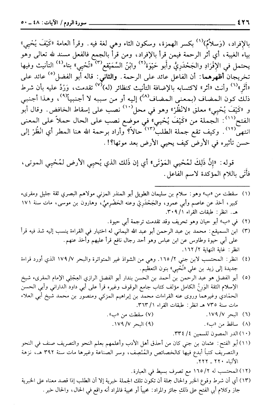 بالإفراد: (وَسلاَّمٌ) بكسر الهمزة، وسكون الثاء وهي لغة فيه. وقرأ العامة «كَيْفَ يُحْيِي» بياء الغيبة، أي أثر الرحمة فيمن قرأ بالإفراد، ومن قرأ بالجمع فالفعل مسند لله تعالى وهو يحتمل في الإِفْرَادِ والجَحْدَرِيُّ وأَبو حَيْوَة وابْنُ السَّمَيْقع «تُحْيِي» بتاء التأنيث وفيها تخريجان أظهرهما: ان الفاعل عائد على الرحمة. والثاني: قاله أبو الفصل عائد على «أَثَرِ» وأنت «أثر» لاكتسابه بالإضافة التأنيث كنظائر (له) تقدمت، وَرُدَّ عليه بأن شرط ذلك كون المضاف (بمعنى المضاف) إليه أو من سببه لا اجنبياً، وهذا أجنبي و «كَيْفَ يُحْيِي» معلق «لأنْظُرْ» وهو في محل نصب على إسقاط الخافض. وقال أبو الفتح: الجملة من «كَيْفَ يُحْيي» في موضع نصب على الحال حملاً على المعنى انتهى. وكيف تقع جملة الطلب حالاً؟ وأراد برحمة الله هنا المطر أي انْظُرْ إلى حسن تأثيره في الأرض كيف يحيي الأرض بعد موتها؟! .
