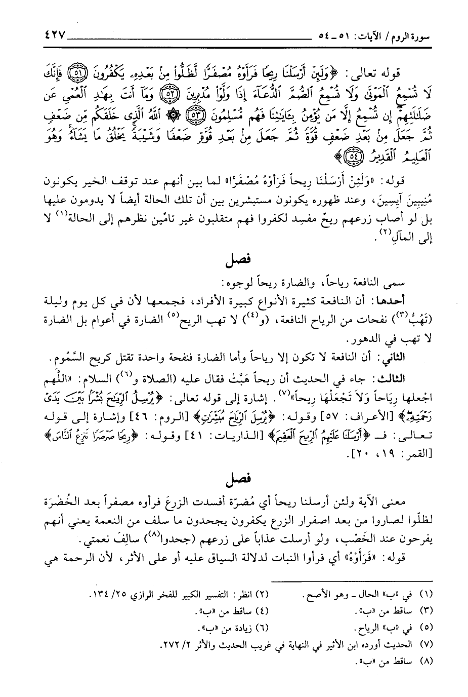 الثالث: جاء في الحديث «أن ريحاً هَبَّتْ فقال عليه (الصلاة و) السلام:» اللَّهم اجْعلها رِيَاحاً وَلاَ تَجْعَلْهَا رِيحاً «إشارة إلى قوله تعالى: {يُرْسِلُ الرياح بُشْرىً بَيْنَ يَدَيْ رَحْمَتِهِ} [الأعراف: 57] وقوله: {يُرْسِلَ الرياح مُبَشِّرَاتٍ} [الروم: 46] وإشارة إلى قوله تعالى: ف {أَرْسَلْنَا عَلَيْهِمُ الريح العقيم} [الذاريات: 41] وقوله: {رِيحاً صَرْصَراً فِي يَوْمِ نَحْسٍ مُّسْتَمِرٍّ تَنزِعُ الناس} [القمر: 19، 20] .
