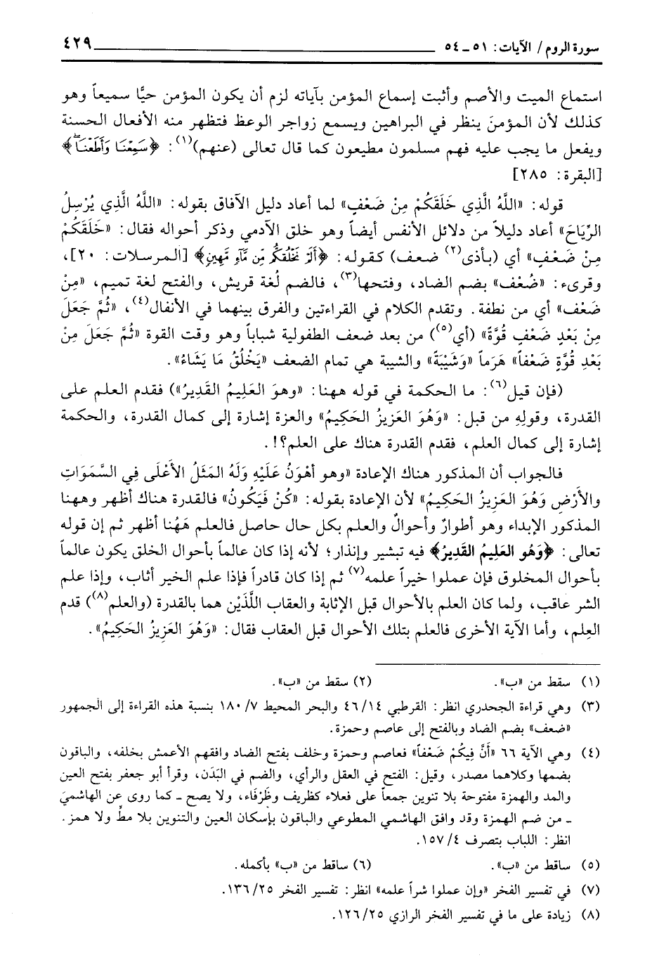 قوله: {الله الذي خَلَقَكُمْ مِّن ضَعْفٍ} لما أعاد دليل الآفاق بقوله: {الله الذي يُرْسِلُ الرياح} [الروم: 48] أعاد دليلاً من دلائل الأنفس أيضاً وهو خلق الآدمي وذكر أحواله فقال: {خَلَقَكُمْ مِّن ضَعْفٍ} أي (بأذى ضعف) كقوله: {أَلَمْ نَخْلُقكُّم مِّن مَّآءٍ مَّهِينٍ} [المرسلات: 20] ، وقرىء: «ضُعْف» بضم الضاد، وفتحها، فالضم لُغة قريش، والفتح لغة تميم «» مِنْ ضَعْف «أي من نطفة. وتقدم الكلام في القراءتين والفرق بينهما في الأنفال، {ثُمَّ جَعَلَ مِنْ بَعْدِ ضَعْفٍ قُوَّةً} (أي) من بعد ضعف الطفولية شباباً وهو وقت القوة {ثُمَّ جَعَلَ مِن بَعْدِ قُوَّةٍ ضَعْفاً} هَرَماً» وَشَيْبَةً «والشيبة هي تمام الضعف {يَخْلُقُ مَا يَشَآءُ} .