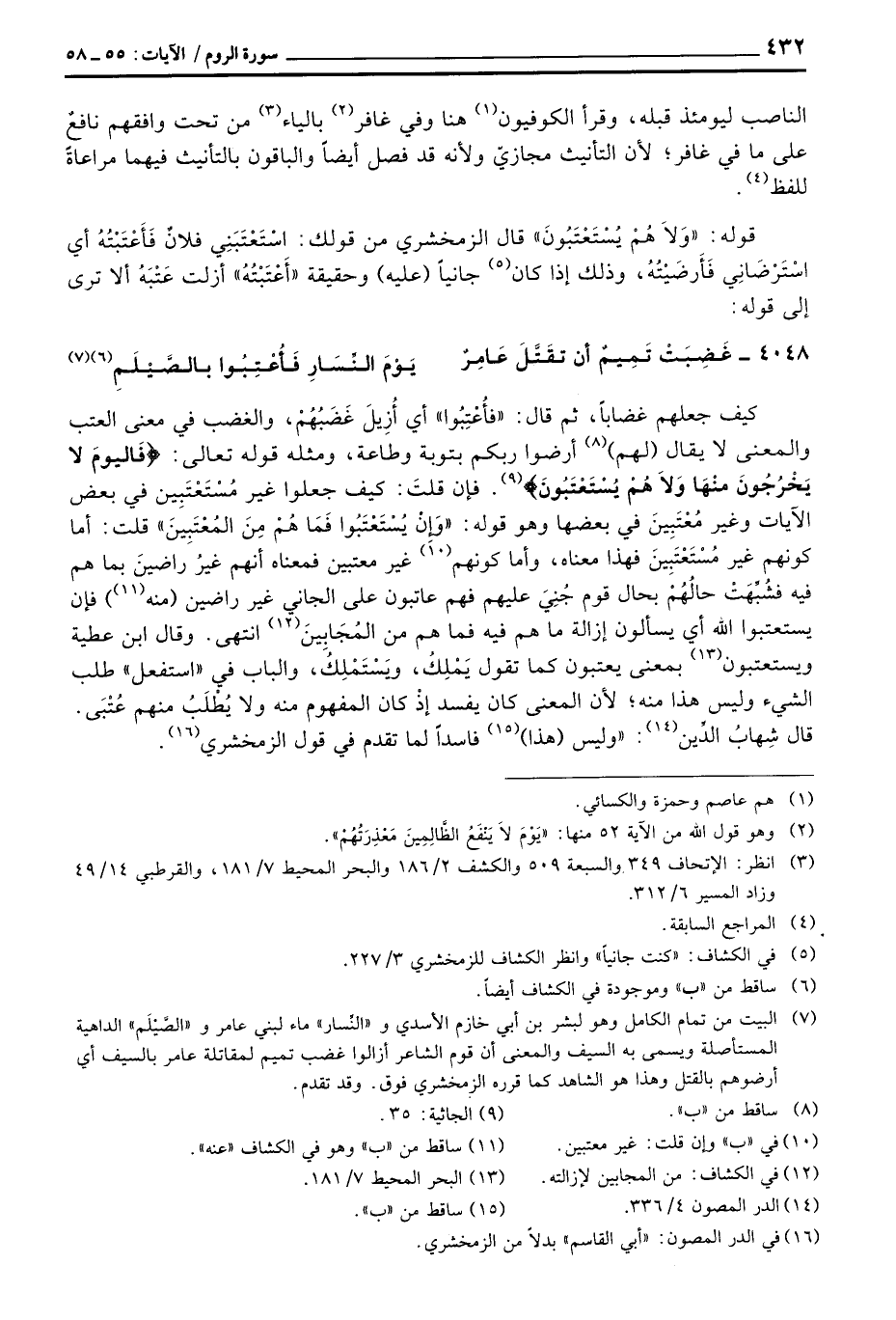 كيف جعلهم غضاباً، ثم قال: «فأُعْتِبُوا» أي أُزِيلَ غَضَبُهُمْ، والغضب في معنى العتب والمعنى لا يقال (لهم) أرضوا ربكم بتوبة وطاعة، ومثله قوله تعالى: {فاليوم لاَ يُخْرَجُونَ مِنْهَا وَلاَ هُمْ يُسْتَعَتَبُونَ} [الجاثية: 35] . فإن قلتَ: كيف جعلوا غير مُسْتَعْتَبِين في بعض الآيات وغير مُعْتَبِينَ في بعضها وهو قوله: {وَإِن يَسْتَعْتِبُواْ فَمَا هُم مِّنَ المعتبين} [فصلت: 24] قلت: أما كونهم غي مُسْتَعْتَبِينَ فهذا معناه، وأما كونهم غير معتبين فمعناه أنهم غيرُ راضينَ بما هم فيه فشُبِّهَتْ حالُهُمْ بحال قوم جُنِيَ عليهم فهم عاتبون على الجاني غير راضين (منه) فإن يستعتبو الله أي يسألون إزالة ما هم فيه فما هم من المُجَابِينَ انتهى. وقال ابن عطية ويستعتبون بمعنى يعتبون كما تقول يَمْلِكث، ويَسْتَمْلِكُ، والباب في «استفعل» طلب الشيء وليس هذا منه؛ لأن المعنى كان يفسد إذْ كان المفهوم منه ولا يُطْلَبُ منهم عُتْبَى، قال شِهابُ الدِّين: وليس (هذا) فاسداً لما تقدم في قوله الزمخشري.