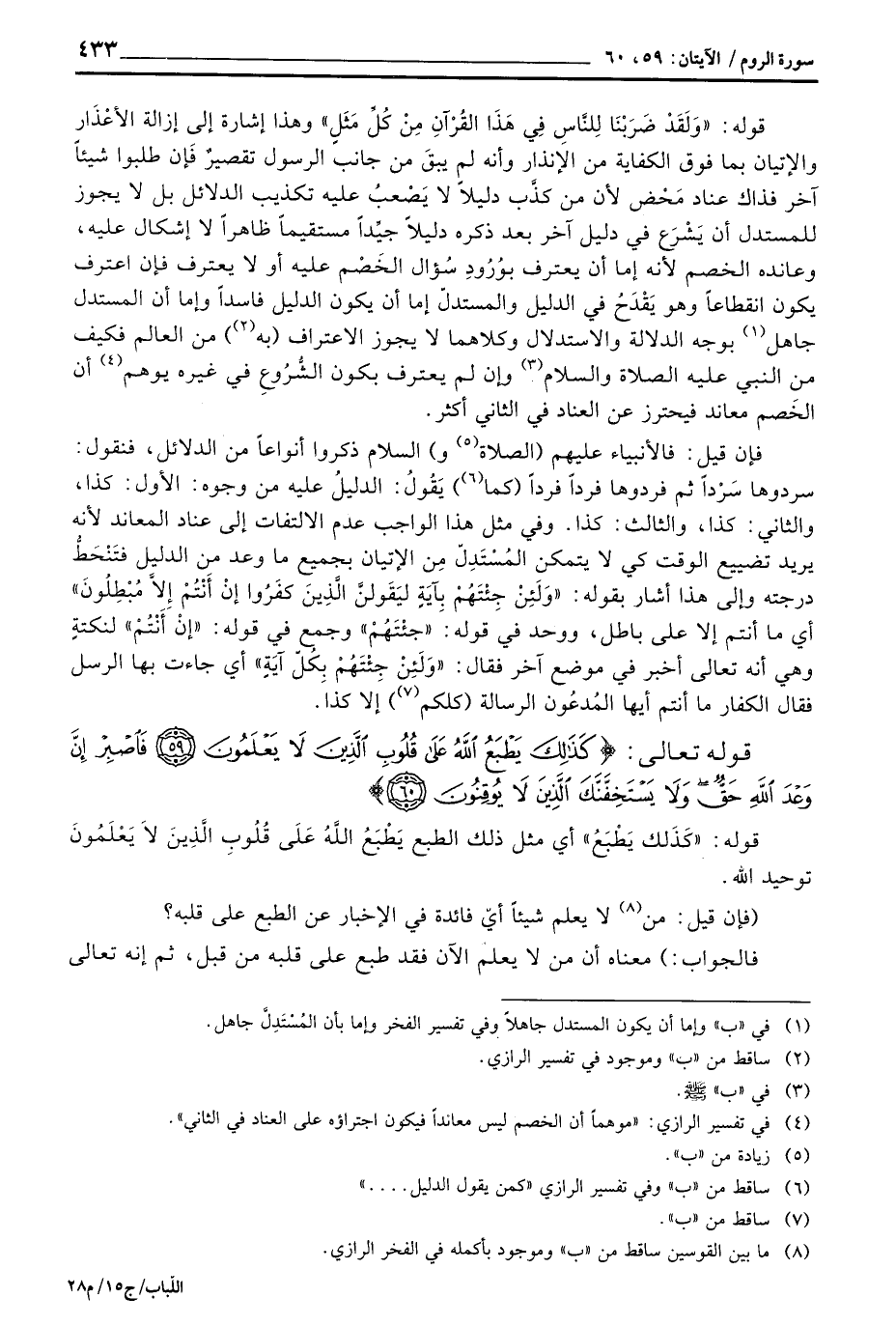 وفي مثل هذا الواجب عدم الالتفات إلى عناد المعاند لأنه يريد تضييع الوقت كي لا يتمكن المُسْتَدِلُ مِن الإتيان بجميع ما وعد من الدليل فتَنْحَطُّ درجته وإلى هذا أشار بقوله: {وَلَئِن جِئْتَهُمْ بِآيَةٍ لَّيَقُولَنَّ الذين كفروا إِنْ أَنتُمْ إِلاَّ مُبْطِلُونَ} أي ما أنتم إلا على باطل، ووحد في قوله: «جئْتَهُمْ» وجمع في قوله: «إنْ أَنْتُمْ» لنكتةٍ وهي أنه تعالى أخبر في موضع آخر فقال: {وَلَئِنْ جِئْتَهُمْ بِكُلِّ آيَةٍ} أي جاءت بها الرسل فقال الكفار ما أنتم أيها المُدعُون الرسالة (كلكم) إلا كذا.