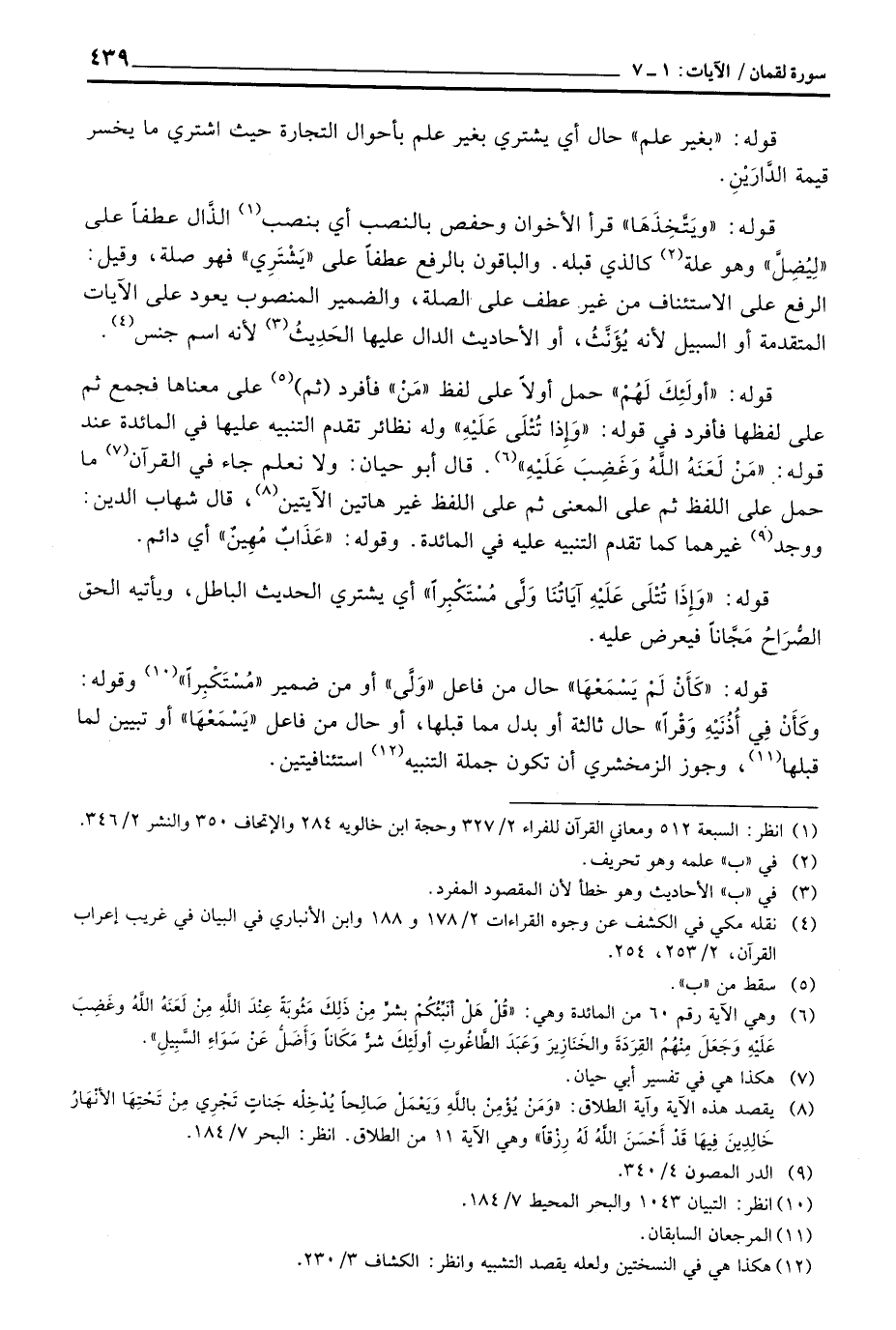 قوله: «أولَئِكَ لَهْمْ» حمل أولاً على لفظ «مَنْ» فأفرد (ثم) على معناها فجمع ثم على لفظها فأفرد في قوله: {وَإِذَا تتلى عَلَيْهِ آيَاتُنَا} وله نظائر تقدم التنبيه عليها في المائدة عند قوله: {مَن لَّعَنَهُ الله وَغَضِبَ عَلَيْهِ} [المائدة: 6] . قال أبو حيان: ولا نعلم جاء في القرآن ما حمل على اللفظ ثم على المعنى ثم على اللفظ غير هاتين الآيتين، قال شهاب الدين: ووجد غيرهما كما تقدم التنبيه عليه في المائدة. وقوله: «عَذَابٌ مُهِينٌ» أي دائم.