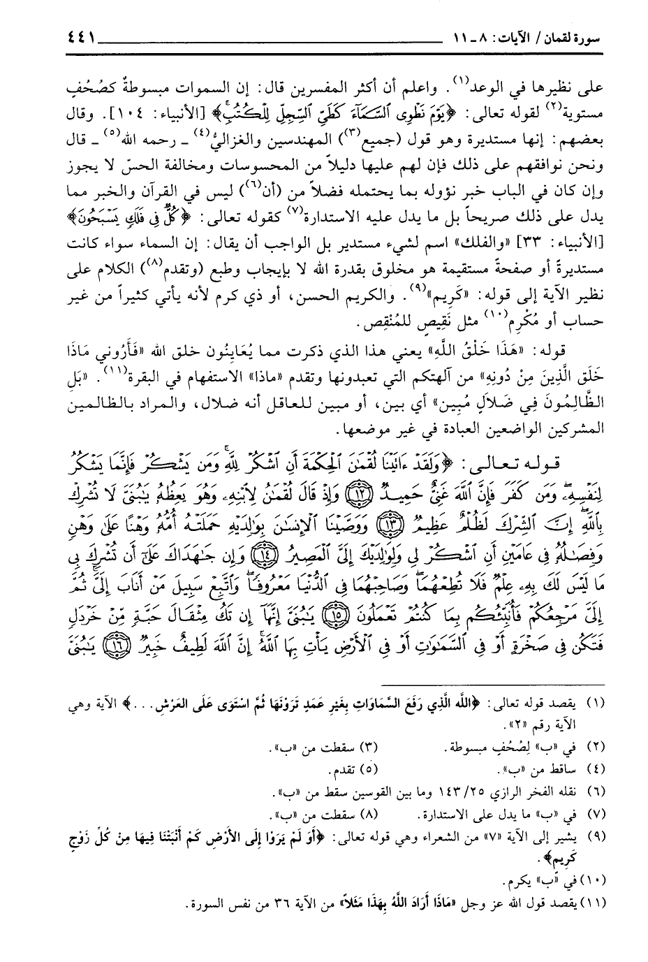 على نظيرها في الوعد. واعلم أن أكثر المفسرين قال: إن السموات مبسوطةً كصُحُفٍ مستوية لقوله تعالى: {يَوْمَ نَطْوِي السمآء كَطَيِّ السجل لِلْكُتُبِ} [الأنبياء: 104] . وقال بعضهم: إنها مستديرة وهو قول (جميع) المهندسين والغزاليُّ - رَحِمَهُ اللَّهُ - قال ونحن نوافقهم على ذلك فإن لهم عليها دليلاً من المحسوسات ومخالفة الحسّ لا يجوز وإن كان في الباب خبر نؤوله بما يحتمله فضلاً من (أن) ليس في القرآن والخبر مما يدل على ذلك صريحاً بل ما يدل عليه الاستدارة كقوله تعالى: {كُلٌّ فِي فَلَكٍ يَسْبَحُونَ} [الأنبياء: 33] «والفلك» اسم لشيء مستدير بل الواجب ان يقال: إن السماء سواء كانت مستديره أو صفحةً مستقيمة هو مخلوق بقدر الله لا بإيجاب وطبع (وتقدم) الكلام على نظير الآية إلى قوله: «كَرِيم» . والكريم الحسن، أو ذي كرم لأنه يأتي كثيراً من غير حساب أو مُكْرِم مثل نَقِيصٍ للمُنْقِص.