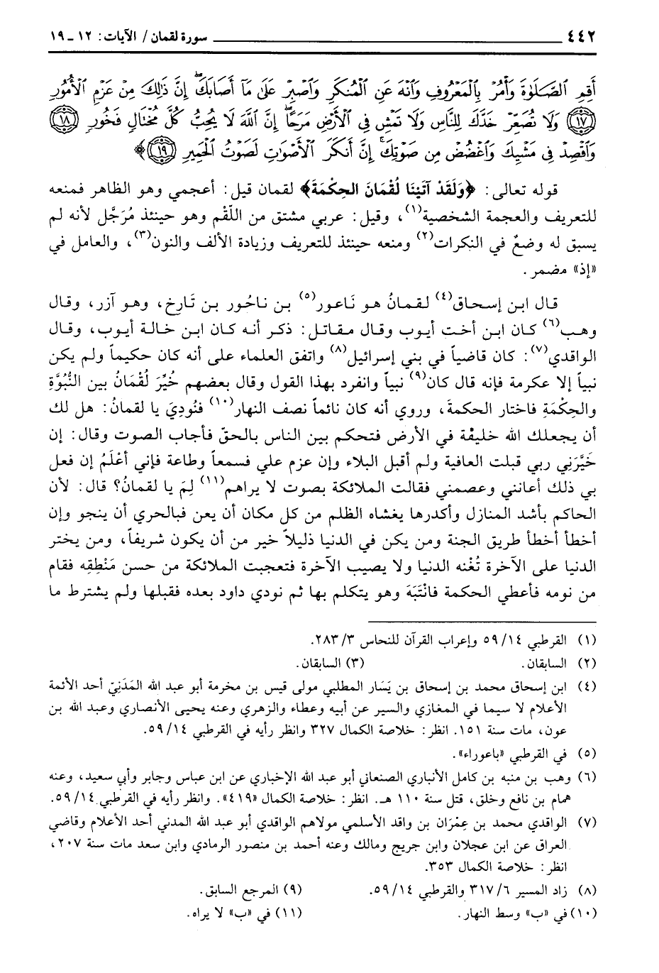 قوله تعالى: {وَلَقَدْ آتَيْنَا لُقْمَانَ الحكمة} لقمان قيل: أعجمي وهو الظاهر فمنعه للتعريف والعجمة الشخصية، وقيل: عربي مشتق من اللّقْم وهو حينئذ مُرَجَّل لأنه لم يبق له وضعٌ في النكرات ومنعه حينئذ للتعريف وزيادة الألف والنون، والعامل في «إذ» مضمر.