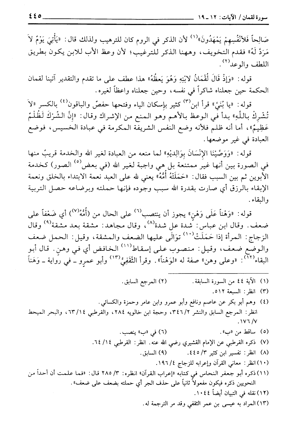 قوله: «يا بُنَيَّ» قرأ ابن كثير بإسكان الياء وفتحها حفصٌ والباقون بالكسر {لاَ تُشْرِكْ بالله} بدأ في الوعظ بالأهم وهو المنع من الإشراك وقال: {إِنَّ الشرك لَظُلْمٌ عَظِيمٌ} ، أما أنه ظلم فلأنه وضع النفس الشريفة المكرمة في عبادة الخسيس، فوضع العبادة في غير موضعها.