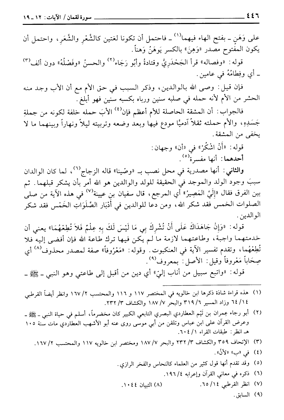 والثاني: أنها مصدرية في محل نصب «وصّينا» قاله الزجاج، لما كان الوالدان سببَ وجود الولد والموجد في الحقيقة للولد والوالدين هو الله أمر بأن يشكر قبلهما. ثم بين الفرق بين «إِلَيَّ المَصِيرُ» أي المرجع، قال سفيان بن عيينة في هذه الآية من صلى الصلوات الخمس فقد شكر الله، ومن دعا للوالدين في أَدْبَار الصَّلَوَاتِ الخَمْس فقد شكر الوالدين.
