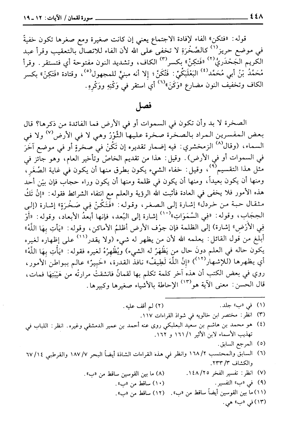 الصخرة لا بد وأن تكون في السموات أو في الأرض فما الفائدة من ذكرها؟ قال بعض المفسرين المراد بالصخرة صخرة عليها الثَّوْرُ وهي لا في الأرض ولا في السماء، (وقال الزمخشري: فيه إضمار تقديره إن تَكُنْ في صخرةٍ أو في موضع آخَرَ في السموات أو في الأرض) . وقيل: هذا من تقديم الخاصّ وتأخر العام، وهو جائز في مثل هذا التقسيم، وقيل: خفاء الشيء يكون بطرق منها أن يكون في غاية الصِّغَرِ، هذه الأمور فلا يخفى في العادة فأثبت الله الرؤية والعلم مع انتفاء الشرائط فقوله: {إنْ تَكُ مثقال حبة من خردل} إشارة إلى الصغر، وقوله: {تَكُنْ فِي صَخْرَةٍ} إشارة (إلى الحِجَاب، وقوله: «فِي السَّمَوَاتِ» إشارة إلى البُعد، فإنها أبعدُ الأبعاد، وقوله: «أَوْ فِي الأَرْضِ» إشارة) إلى الظلمة فإن جوْف الأرض أظلمُ الأماكن، وقوله: {} أبلغ من قول القائل: يعلمه الله لأن من يظهر له شيء (ولا يقدر على إظهاره لغيره يكون حاله في العلم دونَ حال من يَظْهَرُ له الشيء) ويُظْهِرُهُ لغيره فقوله: {يَأْتِ بِهَا الله} أي يظهرها (للإشهار) {إِنَّ الله لَطِيفٌ} نافذ القدرة، «خَبِيرٌ» عالم ببواطن الأمور، روي في بعض الكتب أن هذه آخر كلمة تكلم بها لقمانُ فانشقتْ مرارتُه من هَيْبَتِهَا فمات، قال الحسن: معنى الآية هو الإحاطة بالأشياء صغيرها وكبيرها.