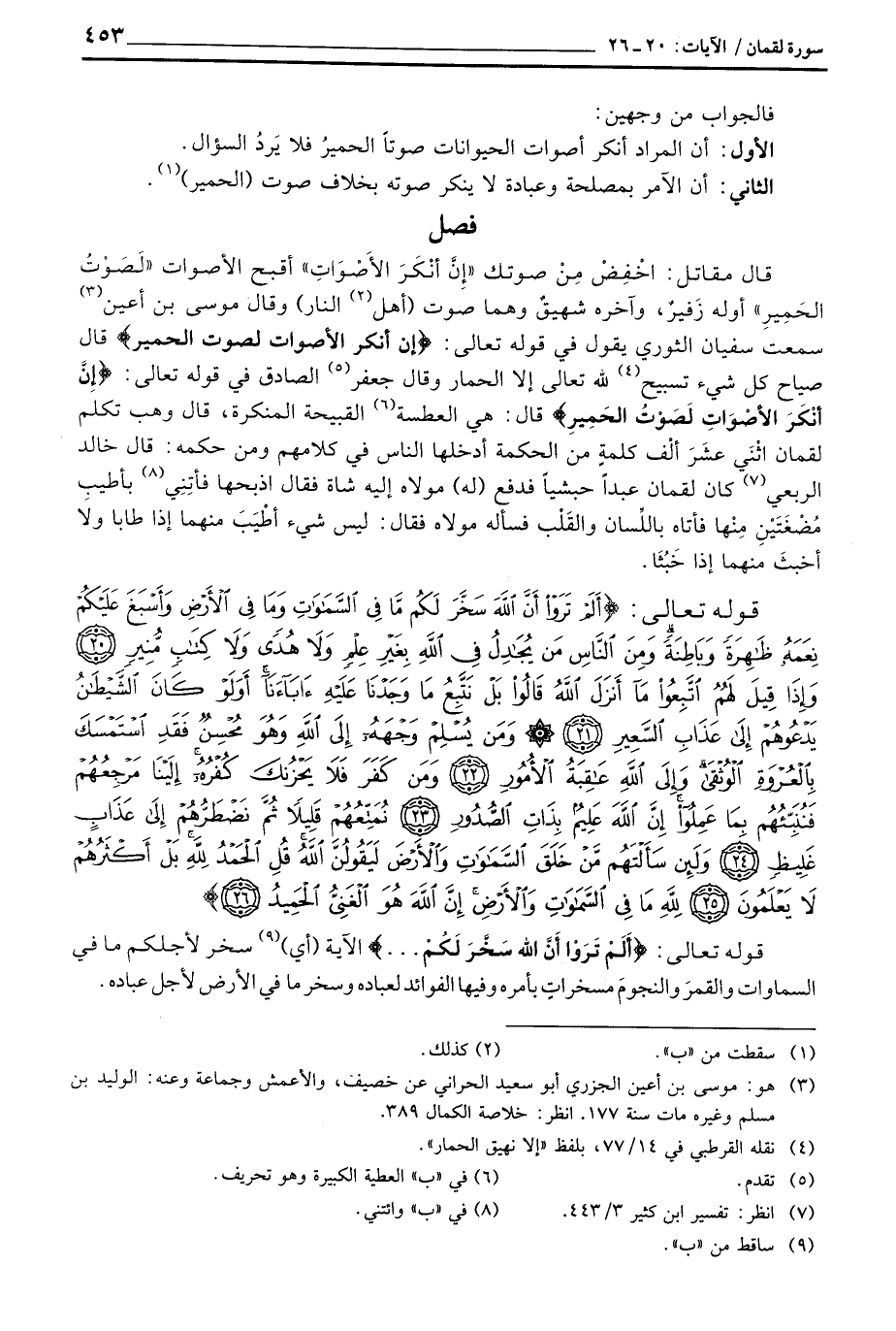 قال مقاتل: اخْفِضْ مِنْ صوتك {إِنَّ أَنكَرَ الأصوات} أقبح الأصوات {لَصَوْتُ الحمير} أوله زَفيرٌ، وآخره شهيقٌ وهما صوت (أهل النار) وقال موسى بن أعين سمعت سفيان الثوري يقول في قوله تعالى: {إن أنكر الأصوات لصوت الحمير} قال صياح كل شيء تسبيح لله تعالى إلا الحمار وقال جعفر الصادق في قوله تعالى: {إِنَّ أَنكَرَ الأصوات لَصَوْتُ الحمير} قال: هي العطسة القبيحة المنكرة، قال وهب تكلم لقمان اثْنَي عشَرَ ألْف كلمةٍ من الحكمة أدخلها الناس في كلامهم ومن حكمه: قال خالد الريعي كان لقمان عبداً حبشياً فدفع (له) مولاه إليه شاة فقال اذبحها فأتِنِي بأطيبِ مُضْغَتَيْنِ مِنْها فأتاه باللِّسان والقَلْب فسأله مولاه فقال: ليس شيء أطْيَبَ منهما إذا طابا ولا أخبثَ منهام إذا خَبُثَا.
