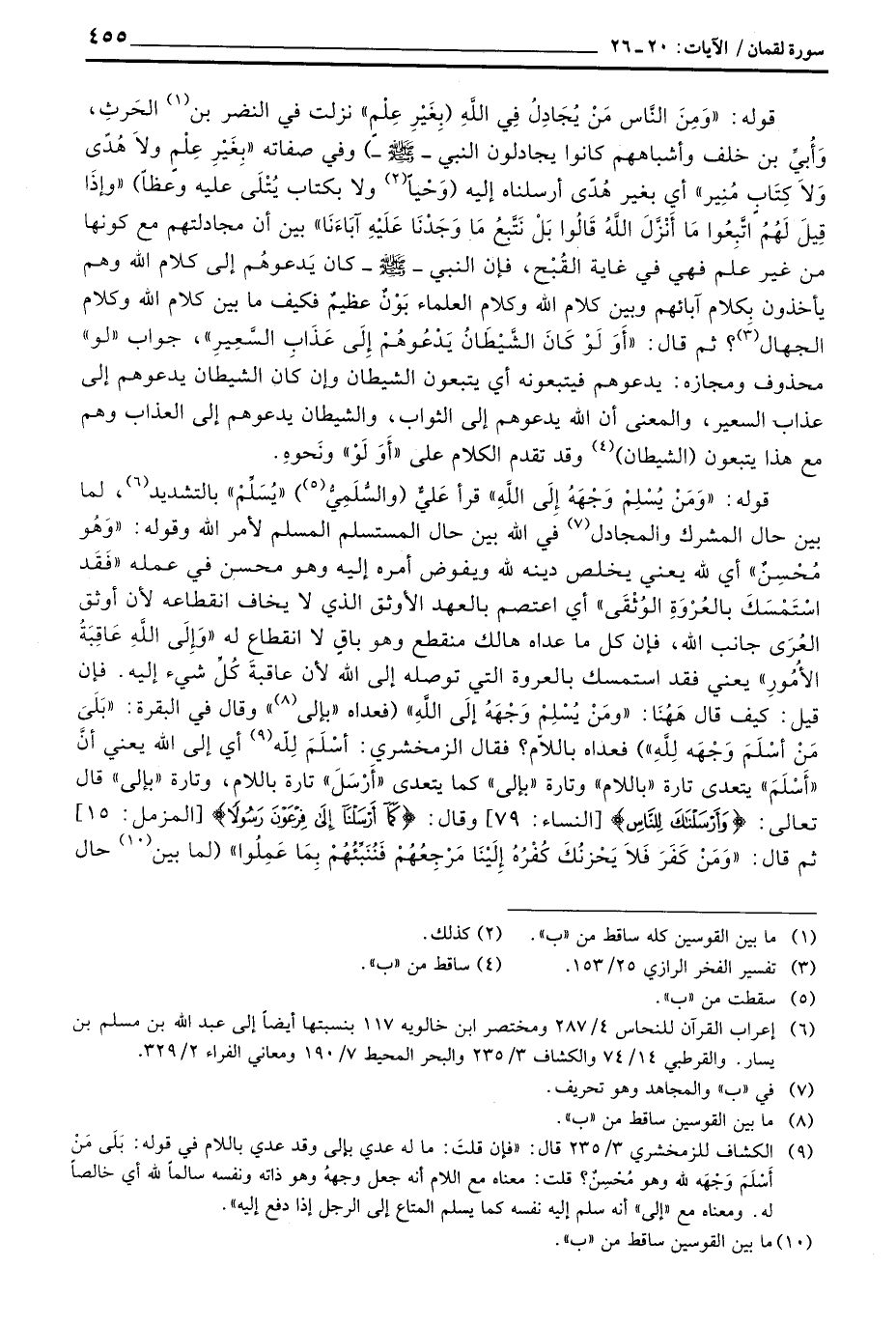قوله: {وَمَن يُسْلِمْ وَجْهَهُ إِلَى الله} قرأ عَليٌّ (والسُّلَمِيُّ) «يُسَلِّمْ» بالتشديد، لما بين حال المشرك والمجادل في الله بين حال المستسلم المسلم لأمر الله وقوله: «وَهُو مُحْسِنٌ» أي لله يعني يخلص دينه لله ويفوض أمره إليه وهو محسن في عمله {فَقَدِ استمسك بالعروة الوثقى} أي اعتصم بالعهد الأوثق الذي لا يخاف انقطاعه لأن أوثق العُرَى جانب الله، فإن كل ما عداه هالك منقطع وهو باقٍ لا انقطاع له {وإلى الله عَاقِبَةُ الأمور} يعني فقد استمسك بالعروة التي توصله إلى الله لأن عاقبةَ كُلِّ شيء إليه.