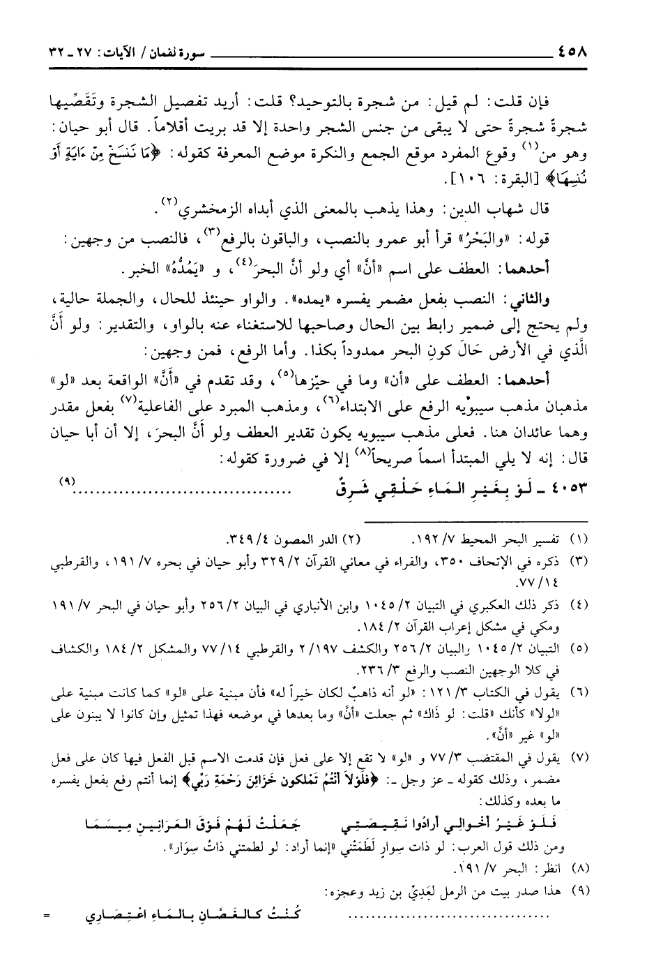 والثاني: النصب بفعل مضمر يفسره» يمده «. والواو حنيئذ للحال، والجملة حالية، ولم يحتج إلى ضمير رابط بين الحال وصاحبها للاستغناء عنه بالواو، والتقدير: ولو أَنَّ الَّذي في الأرض حَالَ كونِ البحر ممدوداً بكذا. وأما الرفع، فمن وجهين: