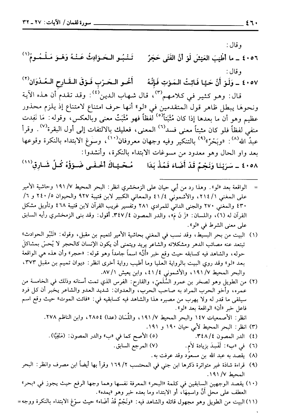 قال: وهو كثير في كلامهم، قال شهاب الدين: وقد تقدم أن هذه الآية ونحوهَا يبطل ظاهر قول المتقدمين في «لو» أنها حرف امتنا لامتناع إذ يلزم محذور عظيم وهو أن ما بعدها إذا كان مُثْبَتاً لفظاً فهو مُثْبَتٌ معنى وبالعكس، وقوله: مَا نَفِدت منفي لفظاً فلو كان مثبتاً معنى فسد المعنى، فعليك بالالتفات إلى أول البقرة. وقرأ عبدُ الله: «وبَحْرٌ» بالتنكير وفيه وجهان معروفان، وسوغ الابتداء بالنكرة وقوعقها بعد واو الحال وهو معدود من مسوغات الابتداء بالنكرة، وأنشدوا: