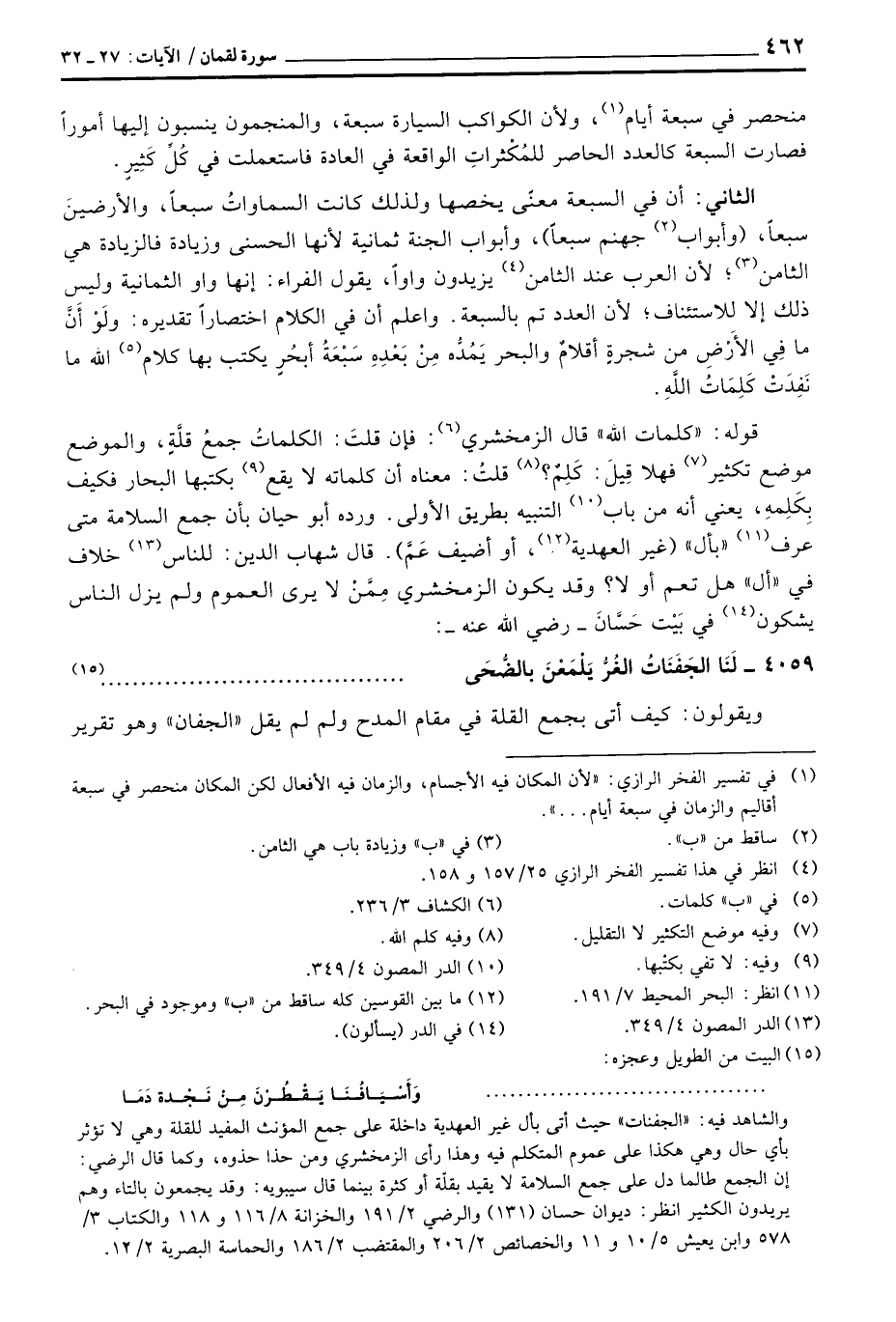 قوله: «كلمات الله» قال الزمخشري: فإن قلتَ: الكلماتُ جمعُ قلَّةٍ، والموضوع موضع تكثير فهلا قِيلَ: كَلِمٌ؟ قلتُ: معناه أن كلماته لا يقع بكتبها البحار يكفي بِكَلِمِهِ، يعني أنه من باب التنبيه بطريق الأولى. ورده أبو حيان بأن جمع السلامة متى عرف «بأل» (غير العهدية، أو أضيف عَمَّ) . قال شهاب الدين: للناس خلاف في «أل» هل تعم أو لا؟ وقد يكون الزمخشري مِمَّنْ لا يرى العموم ولم يزل الناس يشكون في بَيْت حَسَّانَ - رَضِيَ اللَّهُ عَنْه -: