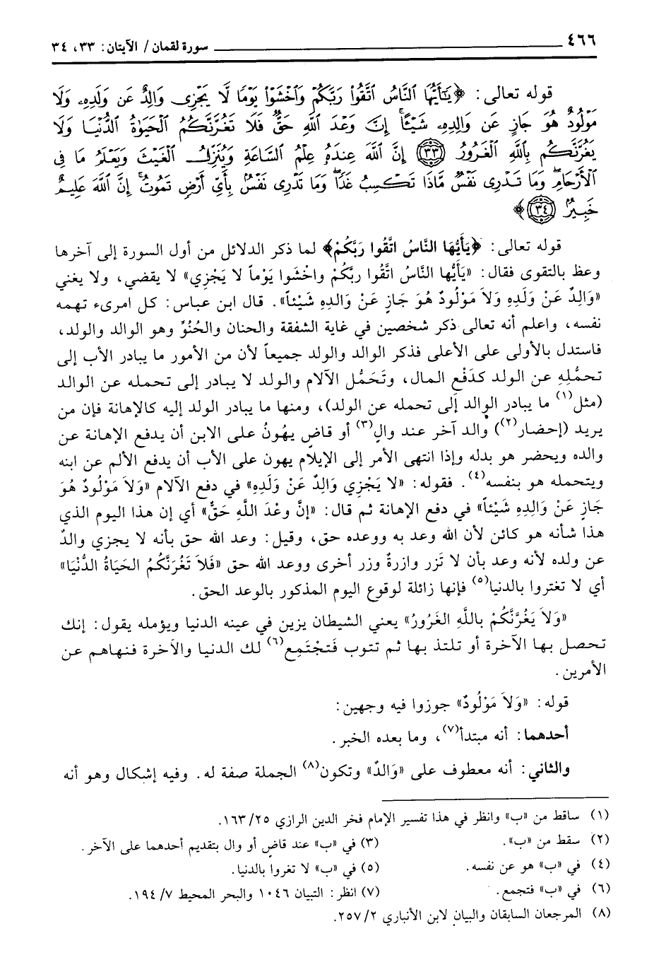 قوله تعالى: {يا أيها الناس اتقوا رَبَّكُمْ} لما ذكر الدلائل من أول السورة إلى آخرها وعظ بالتقوى فقال: {يا أيها الناس اتقوا رَبَّكُمْ واخشوا يَوْماً لاَّ يَجْزِي} لا يقضي، ولا يغني {وَالِدٌ عَن وَلَدِهِ وَلاَ مَوْلُودٌ هُوَ جَازٍ عَن وَالِدِهِ شَيْئاً} . قال ابن عباس: كل امرىء تهمه نفسه، واعلم أنه تعالى ذكر شخصين في غاية الشفقة والحنان والحُنُوِّ وهو الوالد والولد، فاستدل بالأولى على الأعلى فذكر الوالد والولد جميعاً لأن من الأمور ما يبادر الأب إلى تحمُّلِهِ عن الولد كدَفْع المال، وتَحَمُّل الآلام والولد لا يبادر إلى تحمله عن الوالد (مثل ما يبادر الوالد إلى تحمله عن الولد) ، ومنها ما يبادر الولد إليه كالإهانة فإن من يريد (إحضار) والد آخر عند والٍ أو قاضٍ يهُونُ على الابن أن يدفع الإهانة عن والده ويحضر هو بدله وإذا انتهى الأمر إلى الإيلام يهون على الأب أن يدفع الألم عن ابنه وستحمله هو بنفسه. فقوله: {لاَّ يَجْزِي وَالِدٌ عَن وَلَدِهِ} في دفع الآلام {وَلاَ مَوْلُودٌ هُوَ جَازٍ عَن وَالِدِهِ شَيْئاً} في دفع الإهانة ثم قال: {إِنَّ وَعْدَ الله حَقٌّ} أي إن هذا اليوم الذي هذا شأنه هو كائن لأن الله وعد به ووعده حق، وقيل: وعد الله حق بأنه لا يجزي والدٌ عن ولده لأنه وعد بأن لا تَزر وازرةٌ وزر أخرى ووعد الله حق {فَلاَ تَغُرَّنَّكُمُ الحياة الدنيا} أي لا تغتروا بالدنيا فإنها زائلة لوقوع اليوم المذكور بالوعد الحق.