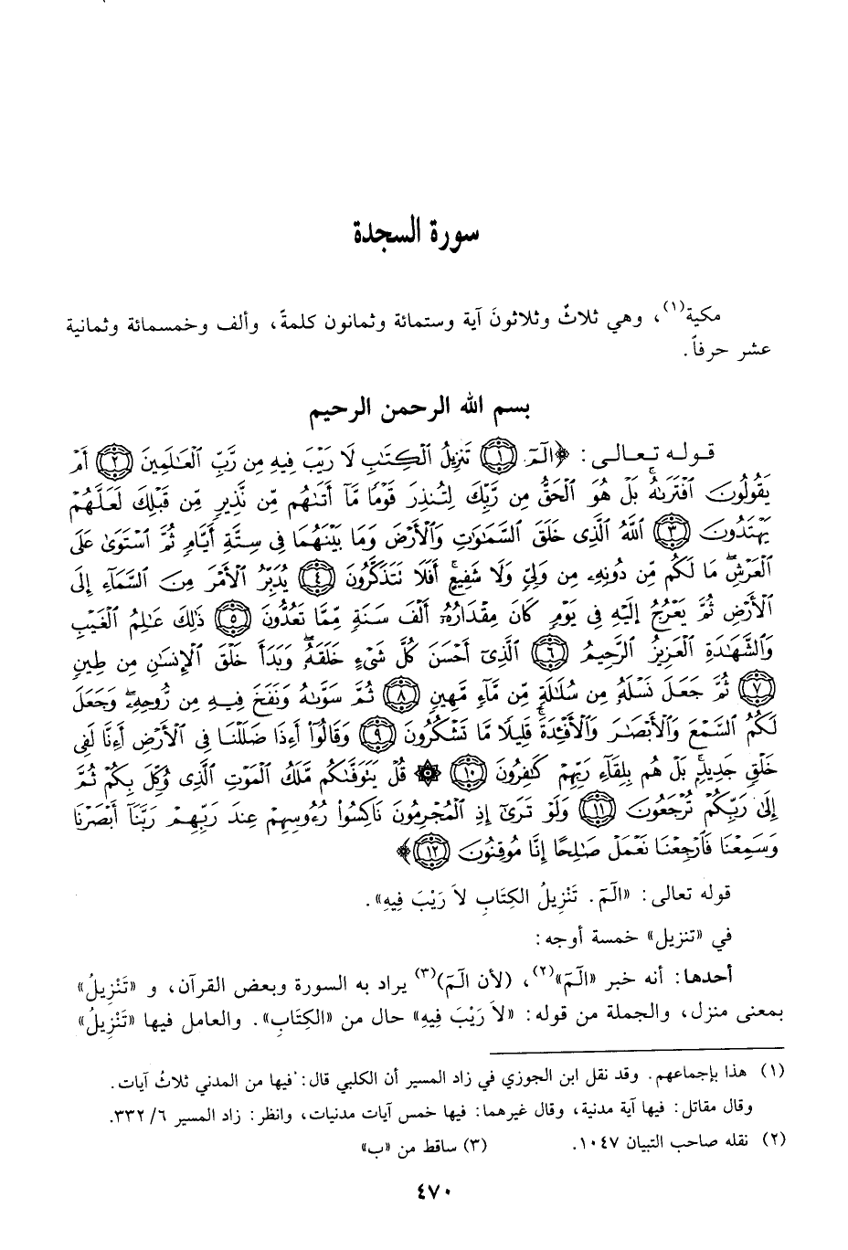 مكية، وهي ثلاث وثلاثون آية وستمائة وثمانون كلمة، وألف وخمسمائة وثمانية عشر حرفا. بسم الله الرحمن الرحيم قوله: {الم تَنزِيلُ الكتاب لاَ رَيْبَ فِيهِ} .