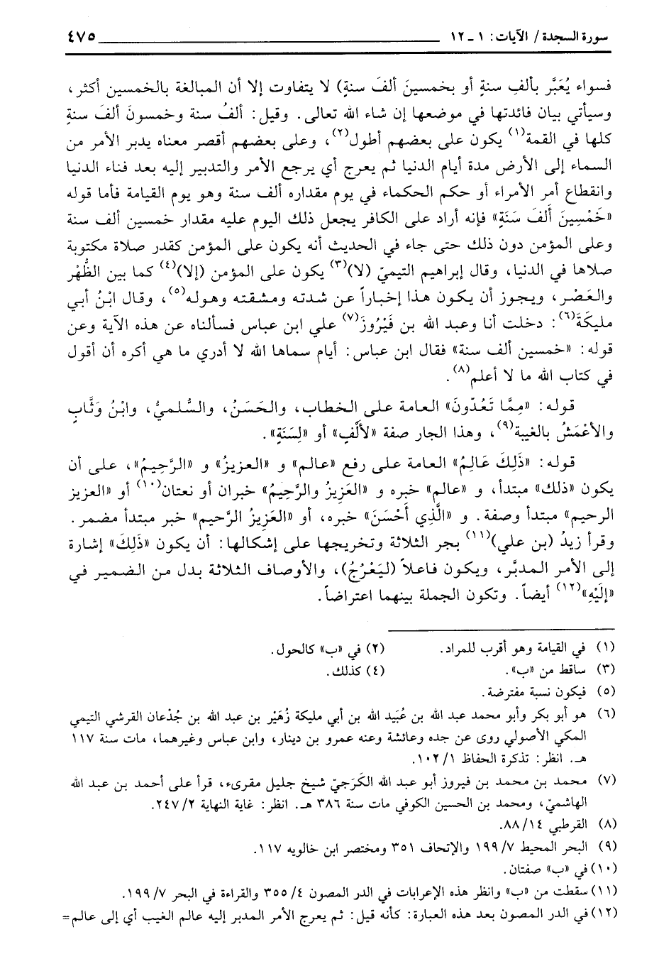 قوله: «ذَلِكَ عَالِمُ» العامة على رفع «عالم» و «العزيزُ» و «الرَّحِيمُ» ، على أن يكون «ذلك» مبتدأ، و «عالم» خبره و «العَزِيزُ والرَّحِيمُ» خبران أو نعتان أو «العزيز الرحيم» مبتدأ وصفة. و «الَّذِي أَحْسَنَ» خبره، أو «العَزِيزُ الرَّحيم» خبر مبتدأ مضمر. وقرأ زيدُ (بن علي) بجر الثلاثة وتخريجها على إشكالها: أن يكون «ذَلِكَ» إشارة إلى الأمر المدبَّر، ويكون فاعلاً (ليَعْرُجُ) ، والأوصاف الثلاثة بدل من الضمير في «إلَيْهِ» أيضاً. وتكون الجلمة بينهما اعتراضاً.
