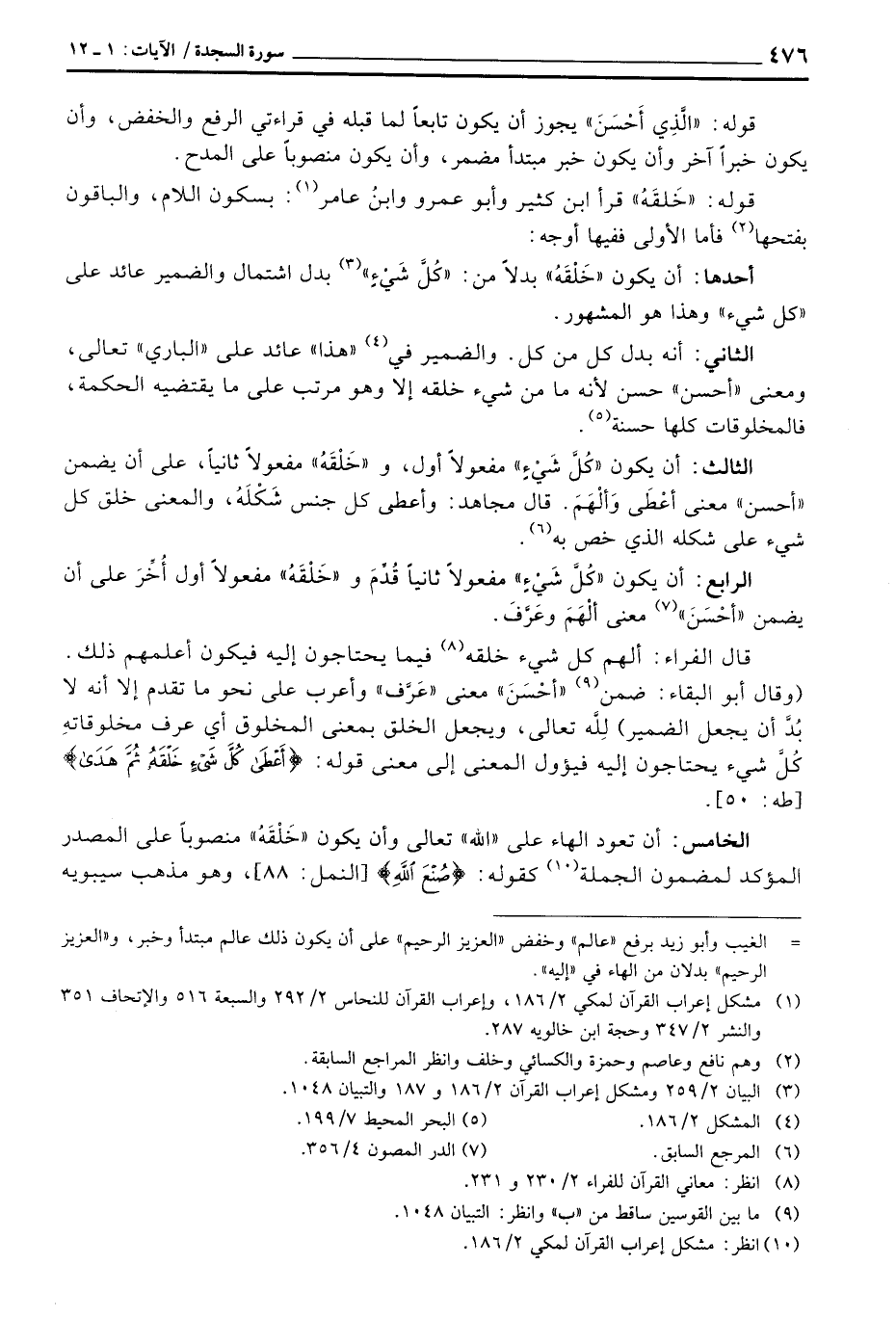 أحدها: أن يكون «خَلْقَهُ» بدلاً من: «كُلَّ شَيْءٍ» بدل اشتمال والضمير عائد على «كل شيء» وهذا هو المشهور.