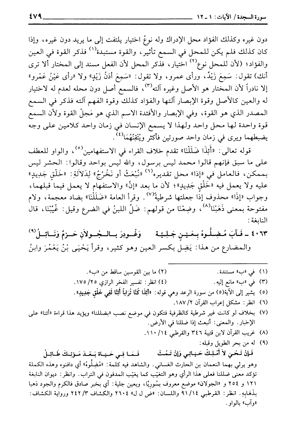 قوله تعالى: «أَئِذَا ضَلَلْنَا» تقدم خلاف القراء في الاستفهامين، والواو للعطف على ما سبق فإنهم قالوا محمد ليس برسول، والله ليس بواحد وقالوا: الحشر ليس بممكن، فالعامل في «إذا» محل تقديره «نُبْعَثُ أو نَخْرُجُ» لِدَلاَلَةِ: «خَلْقِ جَدِيدٍ» عليه ولا يعمل فيه «خَلْقٍ جَدِيدٍ» ؛ لأن ما بعد «إنَّ» والاستفهام لا يعمل فيما قبلهما، وجواب «إذاً» محذوف إذا جعلتها شرطية. وقرأ العامة «ضَلَلْنَا» بضاد معجمة، ولام مفتوحة بمعنى ذَهَبْنَا، وضِعْنَا من قولهم: ضَلَّ اللبنُ في الضرع وقيل: غُيِّبْنَا، قال النابغة: