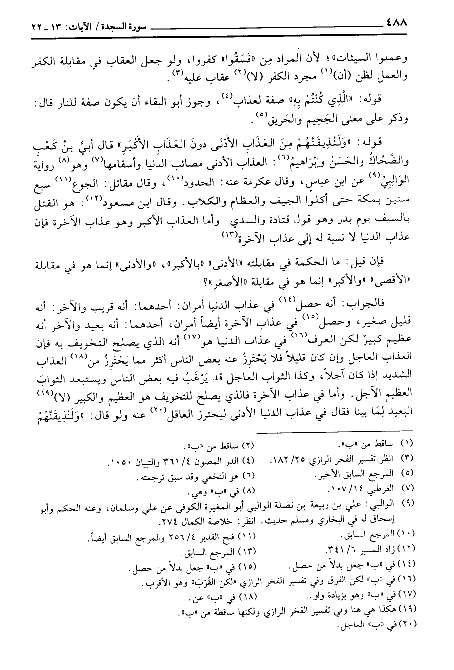 قوله: {وَلَنُذِيقَنَّهُمْ مِّنَ العذاب الأدنى دُونَ العذاب الأكبر} قال أبيُّ بنُ كَعْبٍ والضَّحَّاكُ والحَسَنُ وإبْرَاهيمُ: العذاب الأدنى مصائب الدنيا وأسقامها وهو رواية الوَالبِيِّ عن ابن عباسٍ، وقال عكرمة عنه: الحدود، وقال مقاتل: الجوع سبع سنين بمكة حتى أكلوا الجيف والعظام والكلاب. وقال ابن مسعود: هو القتل بالسيف يوم بدر وهو قول قتادة والسدي. وأما العذاب الأكبر وهو عذاب الآخرة فإن عذاب الدنيا لا نسبة له إلى عذاب الآخرة.